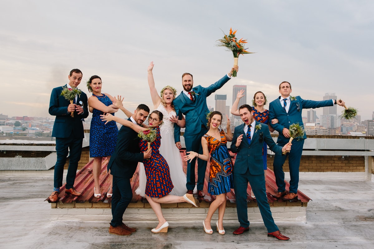One of my fave things about running SBB is that, even though I love all the beautiful, elegant, ethereal, fine art style weddings and shoots that cross my desk, every now and again, something bright and bold and proudly, uniquely South African lands in my inbox and announces its presence like the happy toot of a vuvuzela. And I LOVE it. Today’s wedding is one of these fabulous, colourful creatures, a celebration of everything Jozi and South Africa, full of fun and romance. Bride and groom Samantha and Richard met in Johannesburg, and since it formed such a vital part of their story, they decided to opt for an urban celebration that was pure modern Joburg, from the rooftop ceremony venue with the city skyline on display to the African print bridesmaid dresses and groomsmen’s accessories, to florals like proteas and strelizias, right on down to the food (from the couple’s favourite Melville restaurant). It’s fierce and fun, and totally awesome. Judith BelleĀ captured these images of the big day.