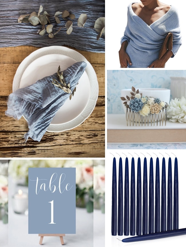 Row 1: Norma J Skirt in Slate by Sweet Caroline Styles | Row 2: ASOS Slim Suit in Blue Mini Check (left); floral noir Wedding Invitation from Minted (right) | Row 3: Gray Blue Silk Ribbon by Krasnova Silk | Row 4: Dusty Blue Gauze Napkins by Linen Lark (top left); Dusty Blue Printable Table Numbers by Heaven and Fifth Studio (bottom left); LAICIGO Womens Cross Wrap Off The Shoulder Sweater (top right); Dusty Blue Flower Comb by Marolsha (centre right); Elegant Navy Blue Dripless Taper Candles (bottom right)