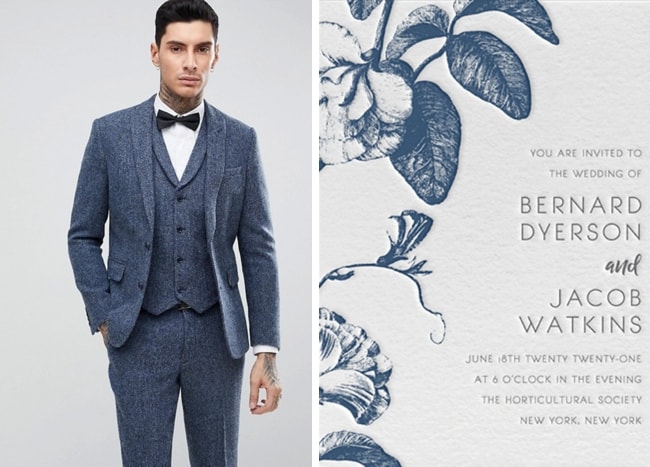 Row 2: Autumn Couple (Moira West) | Dusty Blue Botanical Wedding Invitation (Minted) | Blue Tweed Suit (ASOS)