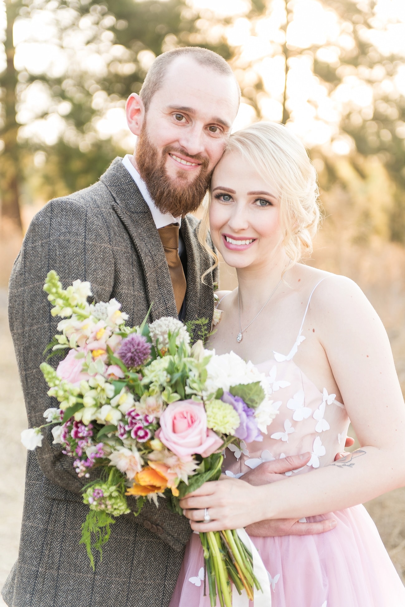 This wedding is a delight, start to finish! A palette that’s like a breath of spring air (even though it took place in winter) – pastels and brights all mixed in like a meadow of wildflowers. A blush beauty of a wedding dress that’s as whimsical as they come, covered as it is with tiny butterflies (and if you’ve ever been into a butterfly house you’ll know what a magical experience that is, so I just love this idea!). Bridesmaids in glittering rose gold, an aisle lined with flowerpots, a groom in fashionable tweed, hanging flowers, watercolour stationery, bunnies…! Amy and Mark’s gorgeous big day had all of it and was filled with colour and love, right down to the shower of confetti that rained down on them as they took their first steps to music as husband and wife. The wonderful Jack and Jane were there to take these fantastic pictures!