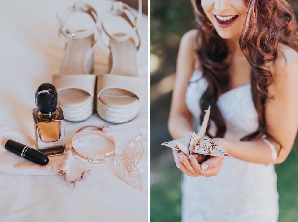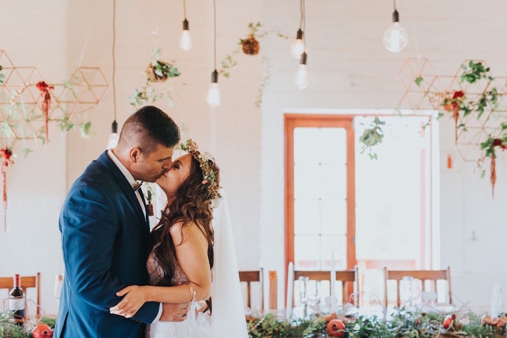 There are some weddings I fall in love with more every time I look at them, and Juan and Mari’s is one of them! Which probably has something to do with the fact that Mari is such a creative soul – not only did she design all the stationery for her big day, and come up with some gorgeously unique ideas (like the cork boutonnieres and origami crane invitations), she applied to same creativity to writing a sweet poem that bagged the couple two of our favourite wedding cinematographers, the fab Barefeet Videography, in a competition they ran (be sure to check out the video at the end of the post!). The style was modern meets bohemian, with a divine palette of pomegranate red, leafy green, and rose gold. I love the mix of clean, contemporary geometrics with more rustic elements, as well as the addition of rose gold safari animals as a nod to the couple’s love of the bushveld. And I LOVE the happiness in all Debbie Lourens‘ wonderful photos – not just between the high school sweethearts who became newlyweds, but among their family and friends as well. What a happy, pretty day.