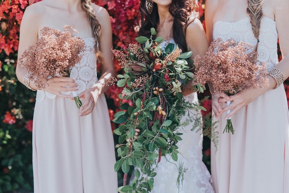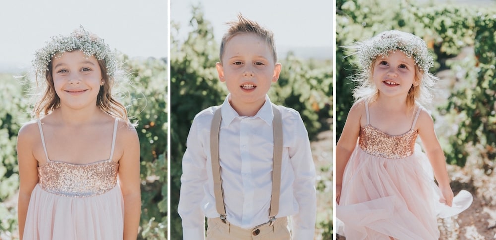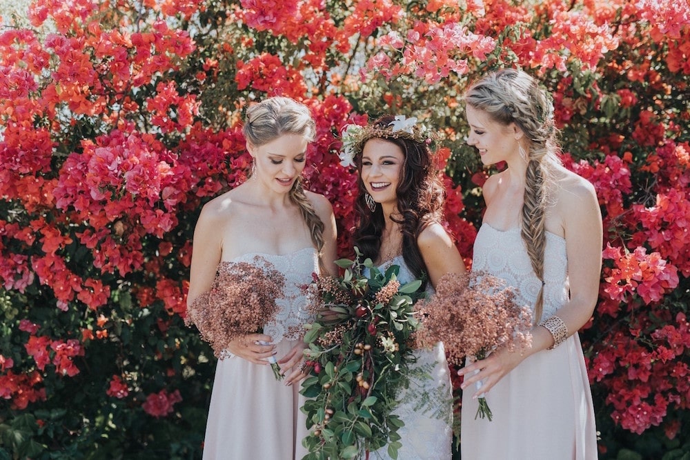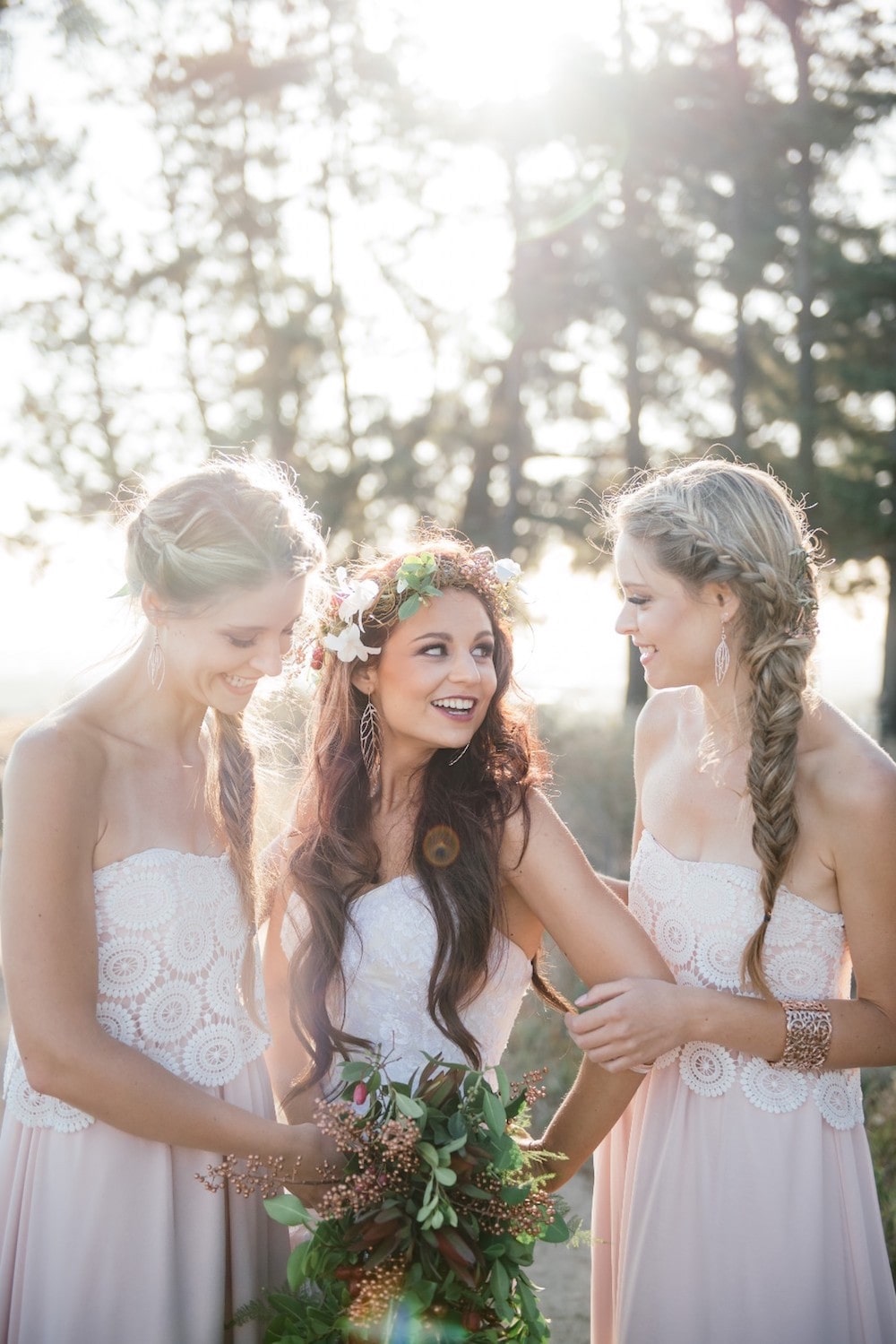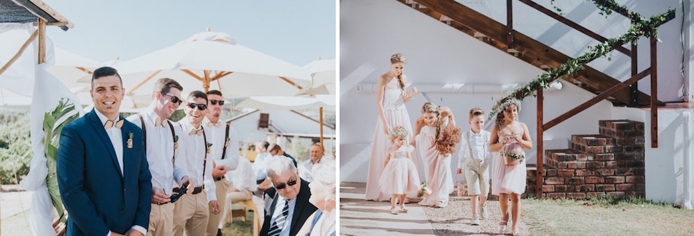 I have two beautiful younger twin sisters and they were my bridesmaids. They know me better than anyone else and were my right hand from the beginning to the end. They went out of their way to arrange a bridal shower that I could only have dreamed of and they supported me emotionally, physically and with all my DIY elements. Hoiden Bridesmaids had a Facebook competition to win 2 x bridesmaid dresses and 2 x flower girl dresses, so I decided to enter. As part of my entry I mentioned and commented that they would be like my fairy Hoiden mothers if I won the competition. I couldn’t believe my eyes when they announced me as the winner, as I am a huge fan of their designs. Marjorie and Esté (the Hoiden team) were amazing and they really made me feel so special (their product quality, service and friendliness were excellent). The dresses that I chose (style HB1612 from the 2016 collection on their website) had white circular lace at the top of the dress and a soft blush colour material at the bottom. This style was a perfect match for the “touch of bohemian” theme. The flower girls’ dresses had rose gold sequins at the top and a soft blush colour material on the bottom.