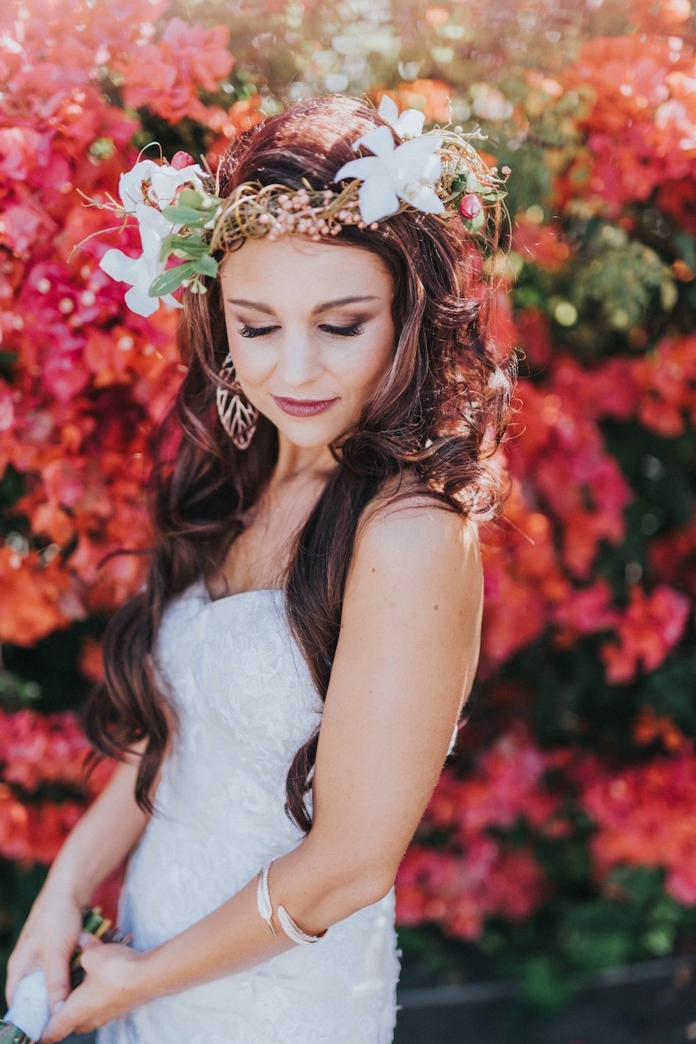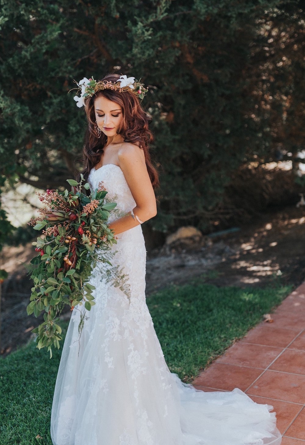 Greenery with berries (some were sprayed with rose gold), amaranthus (mainly used in bouquet) and pomegranates. For the ceremony (outside), the staircase (my dad and I, as well as my bridesmaids, flower girls and ring bearer walked down the staircase) had ivy wrapped around the rail. The one side of the wooden arch was decorated with greens and monstera leaves. We also had two monstera leaves sprayed with rose gold in two large vases in front of the wooden arch. I had a cascade bouquet with greenery, berries (some were sprayed rose gold) and amaranthus, and wore a crown of loosely arranged greens with a few small white flowers and berries. My bridesmaids carried Gypsophila bouquets sprayed with rose gold, and my flower girls wore gypsophilia crowns. For the reception, we had kokedamas hanging from the roof as well as two rose gold shapes hanging above the bridal table, decorated with amaranthus, berries and greenery. The tables had a green leaf runner in the middle of the table with berries and pomegranates.