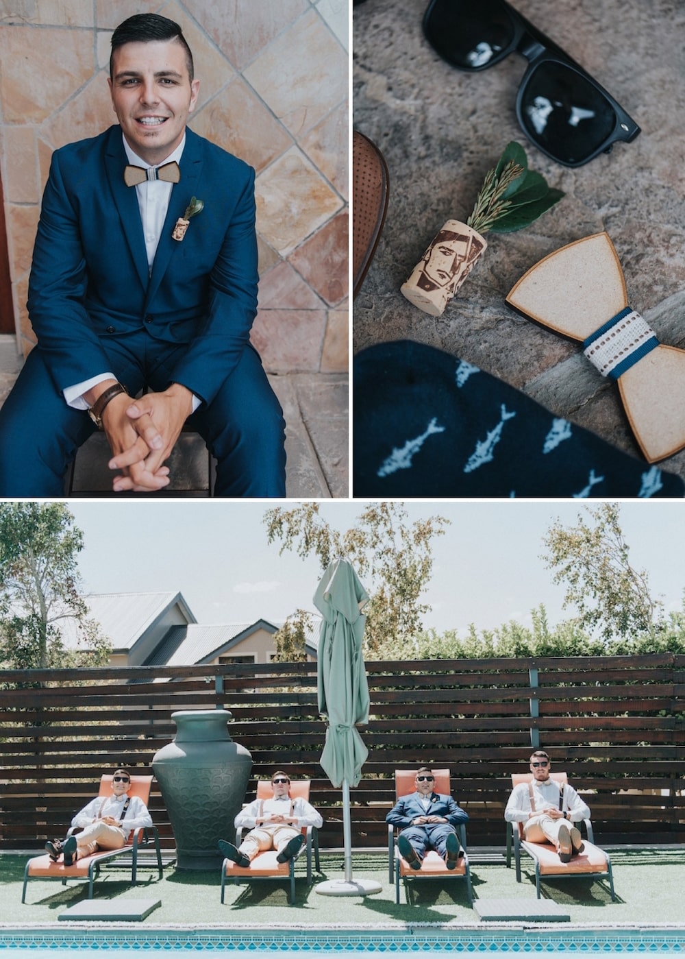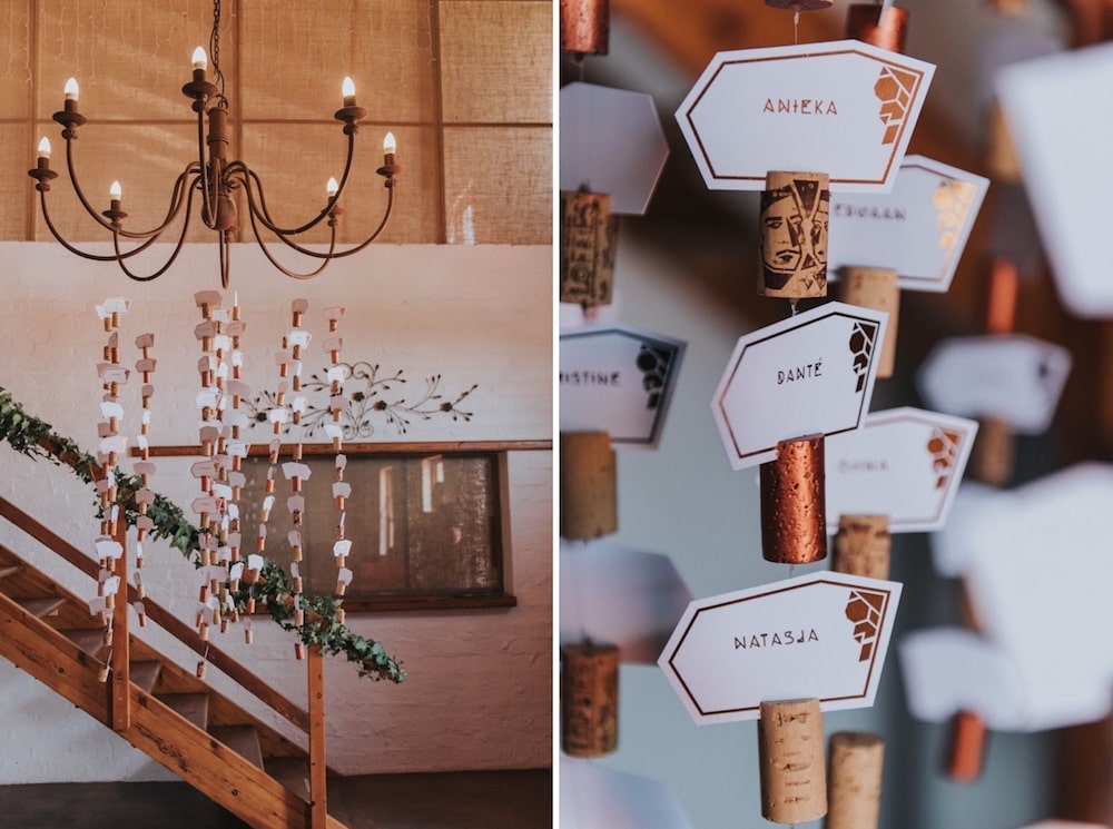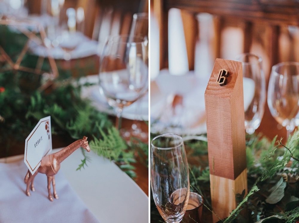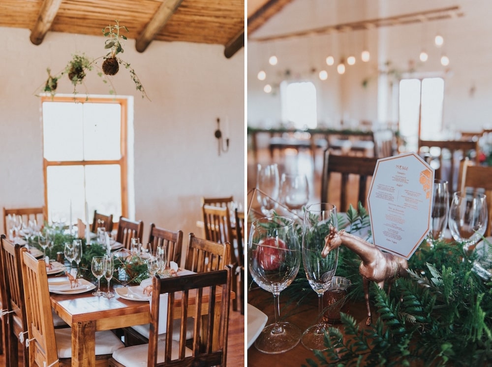 I had many DIY elements, such as designing all of the wedding stationery and creating (with the help of my dad, Juan and my family) some décor elements like the table numbers, wooden arch (ceremony outside), wooden direction signs, rose gold branch candle holder, rose gold Big 5 animal place card and menu holders, origami crane birds (about 300 birds, which were part of the stoep’s décor where the canapés were served), and wooden bow ties (laser cutting done by Cape Craft).