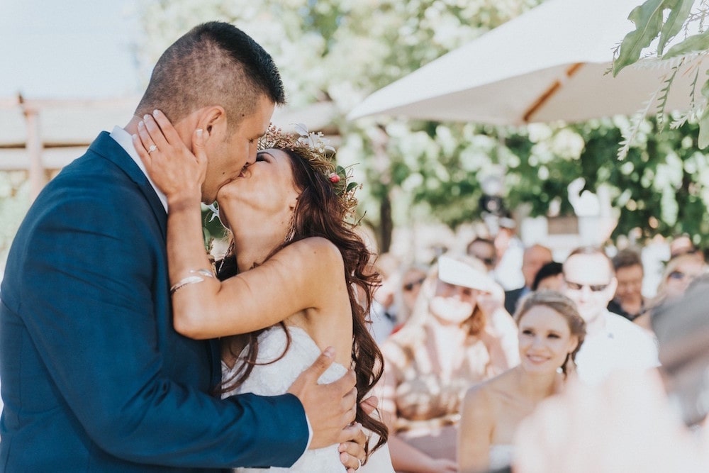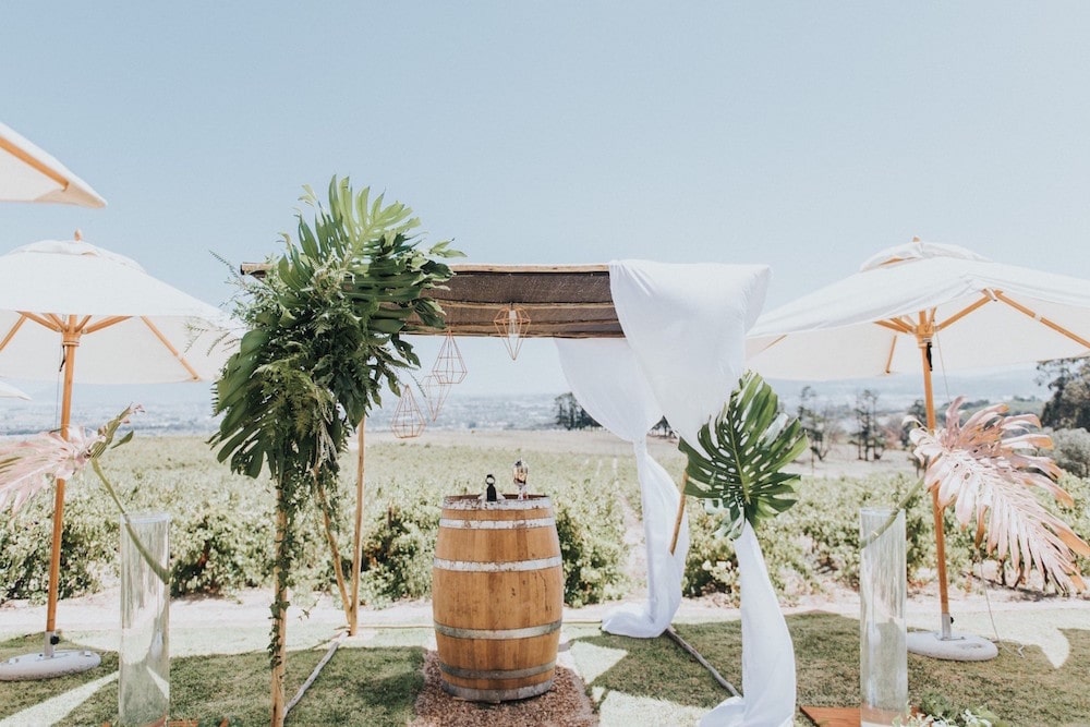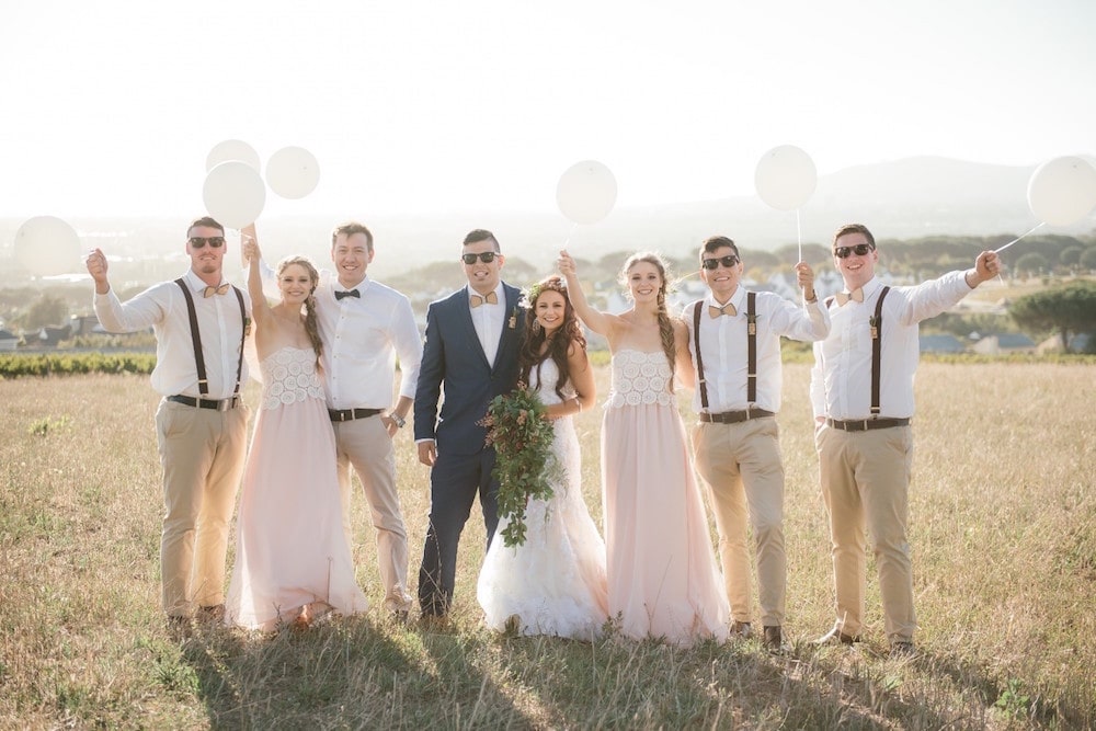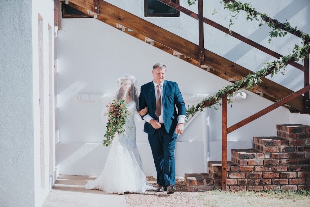 Venue & catering: Altydlig | Catering: Ebony & Ivory Event Management & Catering (via Altydlig) | Photography: Debbie Lourens Photography | Co-ordination: Special Events (Sylvia Strauss) | Flowers & décor: Special Events (Elizabeth from Special Events is now the owner of Betta Lilly floral design and partners with Special Events on a regular basis as a florist) | Stationery: Mari Moodie design studio | Video: Barefeet Videography | Cake: Christelle Fouché (a friend of the bride’s who is also a qualified chef) | Bride’s dress: Maggie Sottero hired from Eve’s Bridal Wear | Bride’s accessories: H&M + Lovisa | Hair & makeup: Lisa Brown | Bridesmaids’ dresses: Hoiden Bridesmaids | Groom’s attire: Woolworths | Hiring: Makiti Hire (rustic wooden benches for ceremony) + Prolific Hiring Supplies (wooden frame umbrellas) + Function Hiring 4U (large glass vases) | DJ: DJ Dean SA