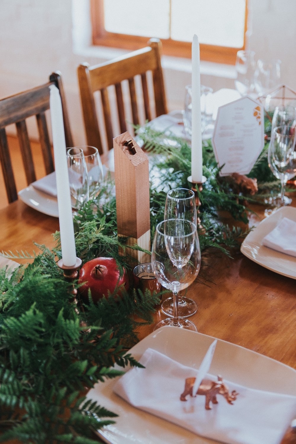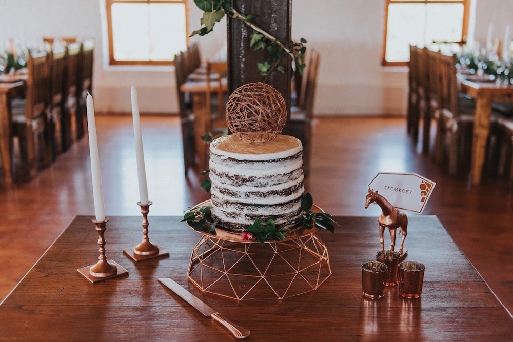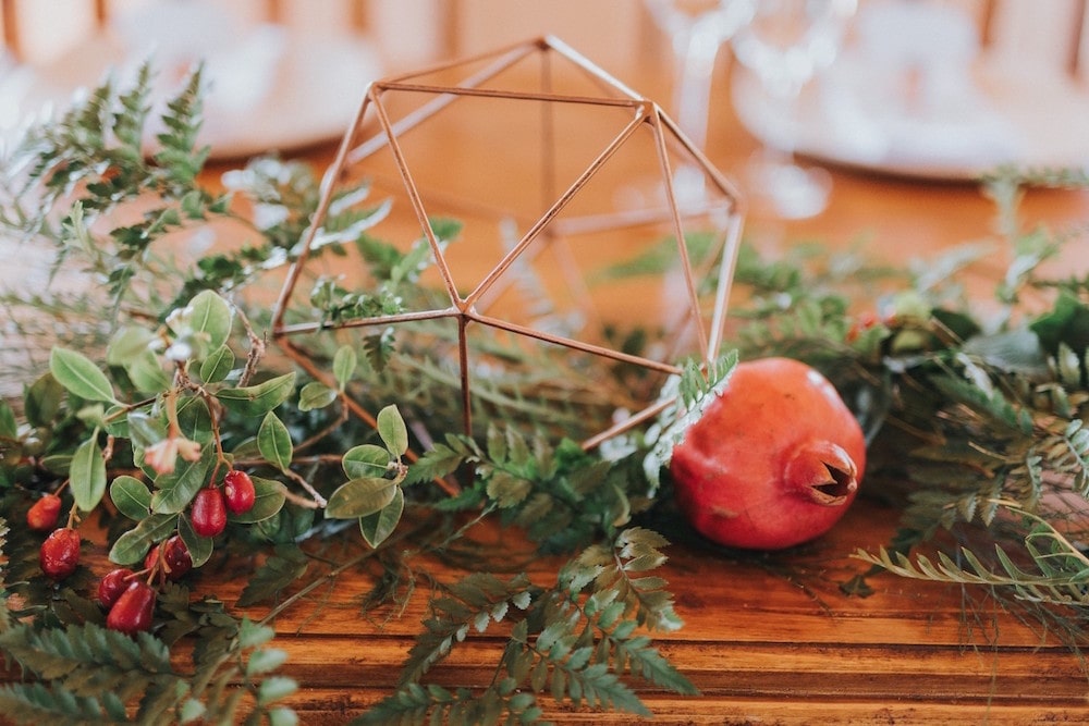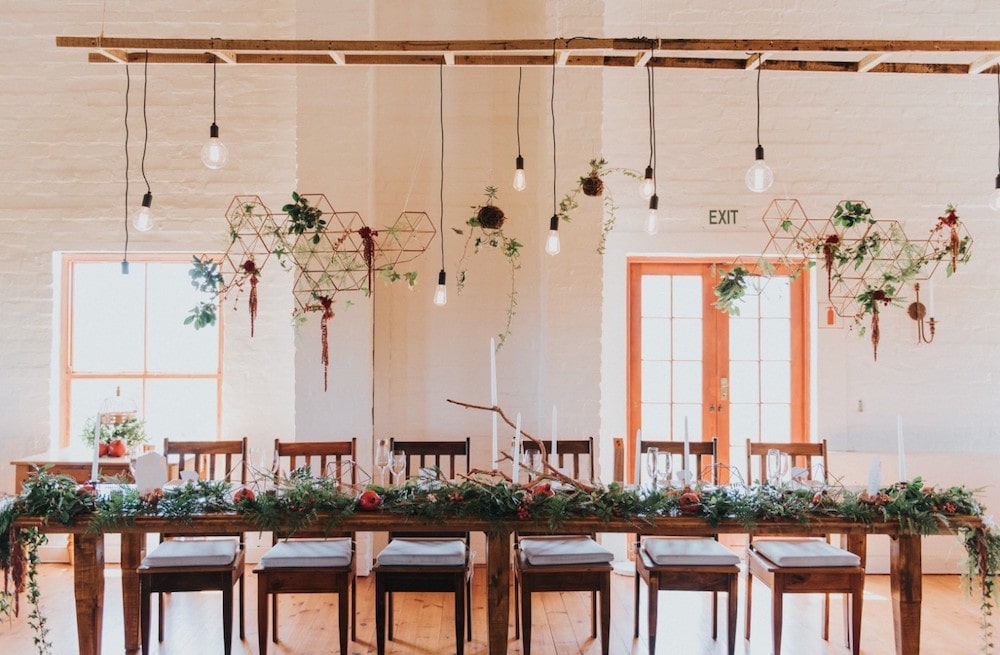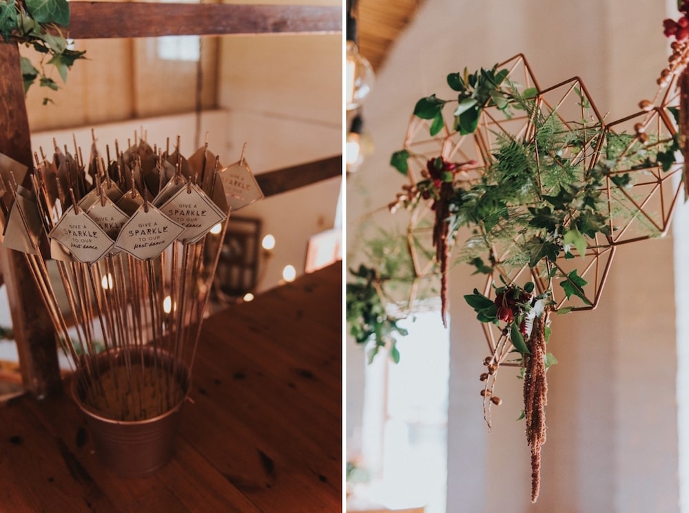 Our wedding theme was modern with a touch of bohemian. My main colour was rose gold with greenery (leaves). Modern elements included rose gold geometric shapes, which were part of the wedding décor and were mainly used as a feature on the tables. A love for nature and birds inspired me to use greenery (leaves & ivy), berries, pomegranates, wooden elements as well as origami paper crane birds, which were also a bohemian element. Some leaves and berries were also sprayed with rose gold, which can also be seen as a modern element. We also had naked bulbs hanging from the roof above the bridal table.