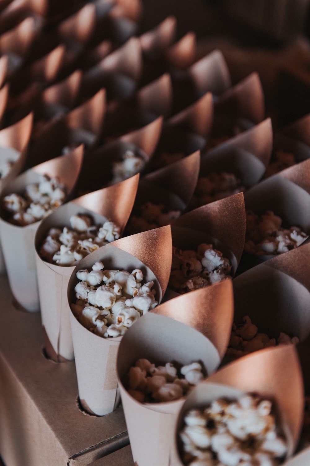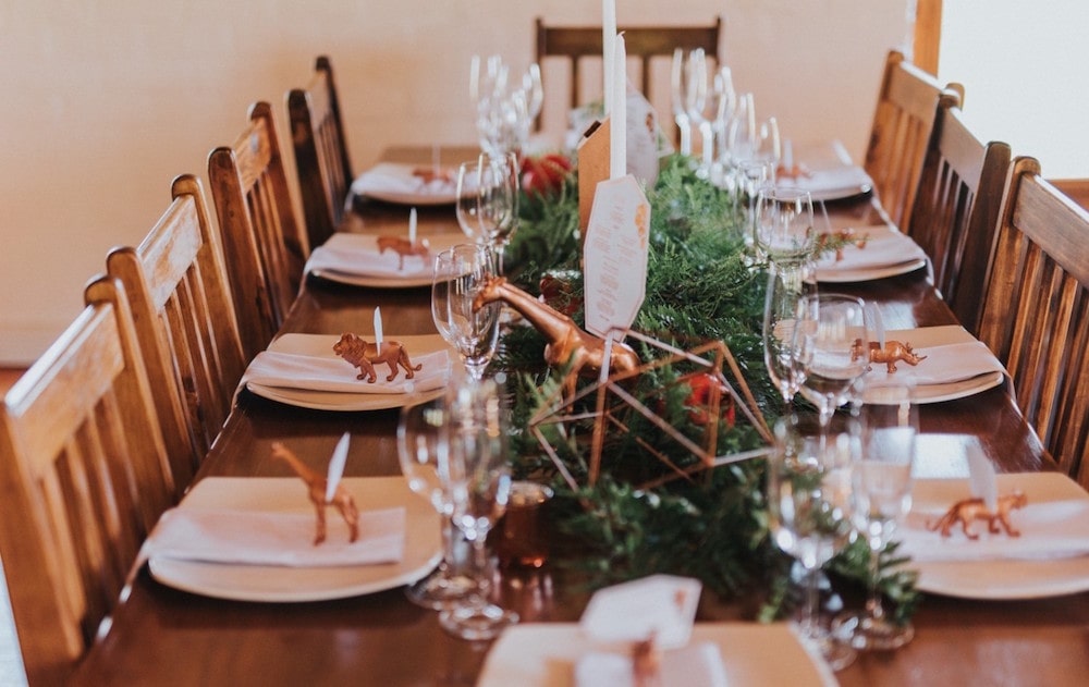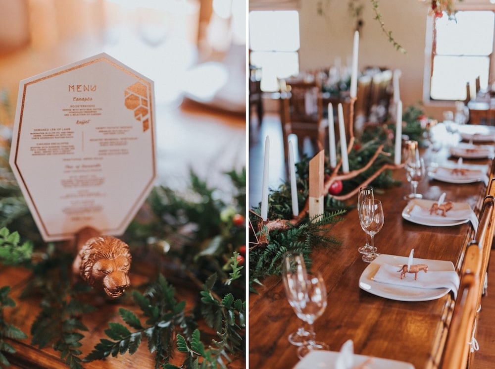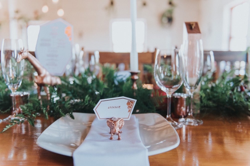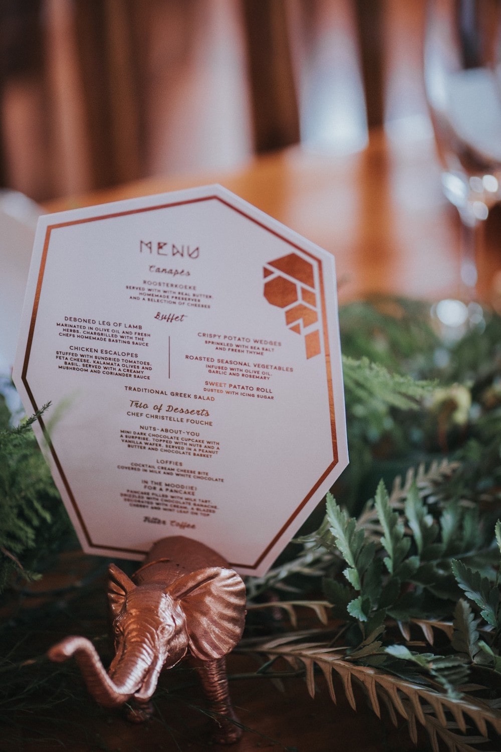 Juan and I both have a love for wildlife and South African National Parks like the Kruger National Park and Kgalagadi. I decided to incorporate the Big 5 by using plastic toy animals and spraying them with rose gold. The smaller size animals were used as name card holders and the bigger size animals as menu holders. I also did my own rose gold foiling on the name cards and menu by using a laminating machine. Our food was also proudly South African, which included traditional dishes like roosterkoeke as canapés, and pancakes filled with milktart as one of the desserts.