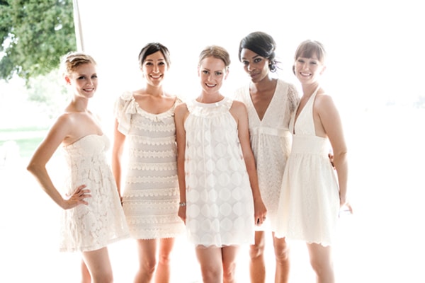 *Updated for 2018*  It’s official: the white bridesmaid dress trend started by Kate and William at their royal wedding is here to stay. Ever since Pippa Middleton showed up in that dress, and brides around the world started thinking “hmm, maybe I should have my bridesmaids in white too” – well, this particular taboo became history once and for all (although, for the record, if you’re a guest and you wear white you’re still an asshat). And yes, your granny might disapprove. But once she sees how beautiful your crew looks… well, I think she’ll come around. Whether it’s a beach wedding or an elegant vineyard soiree, they look crisp and classic (and give you a perfectly clean palette). Need some extra convincing yourself? Just take a look at this roundup of lovely bridal parties. And then check out our top tips for styling the white bridesmaid dress trend so that the bride still stands out, as you should!