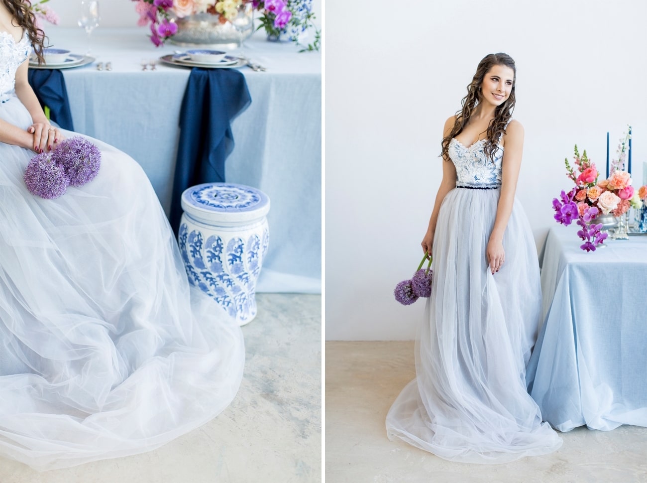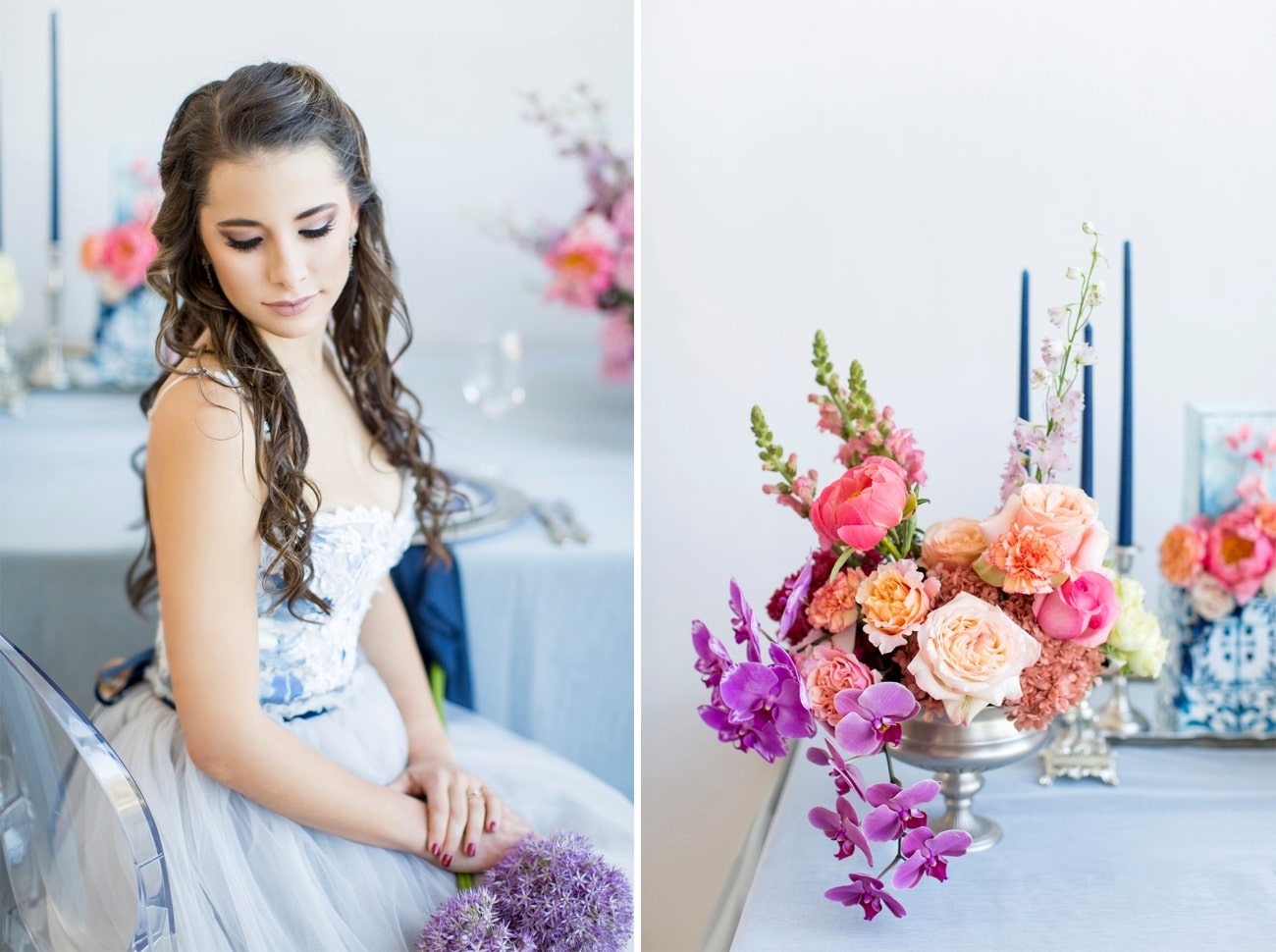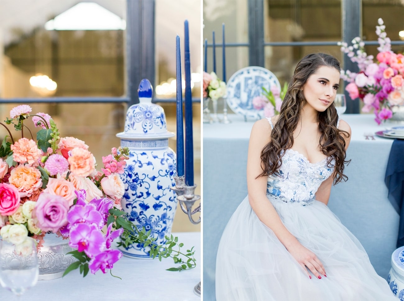 Our inspiration was creating a modern spin on an old fashioned theme and a look that was modern yet soft and romantic, with just a touch of vintage. The colour scheme we used was Delft blue, antique silver and shades of blush. Key elements included: Nederland and Chinese Delft, Victorian silver cutlery, brushed silver, navy blue candles and napkins, a sky blue tablecloth, Delft stools mixed with ghost chairs, and a floral carpet. We used flowers like orchids, peonies, hydrangea, and roses. The bodice of the dress, which was designed, made and hand-painted by Preez, was also Delft-inspired.