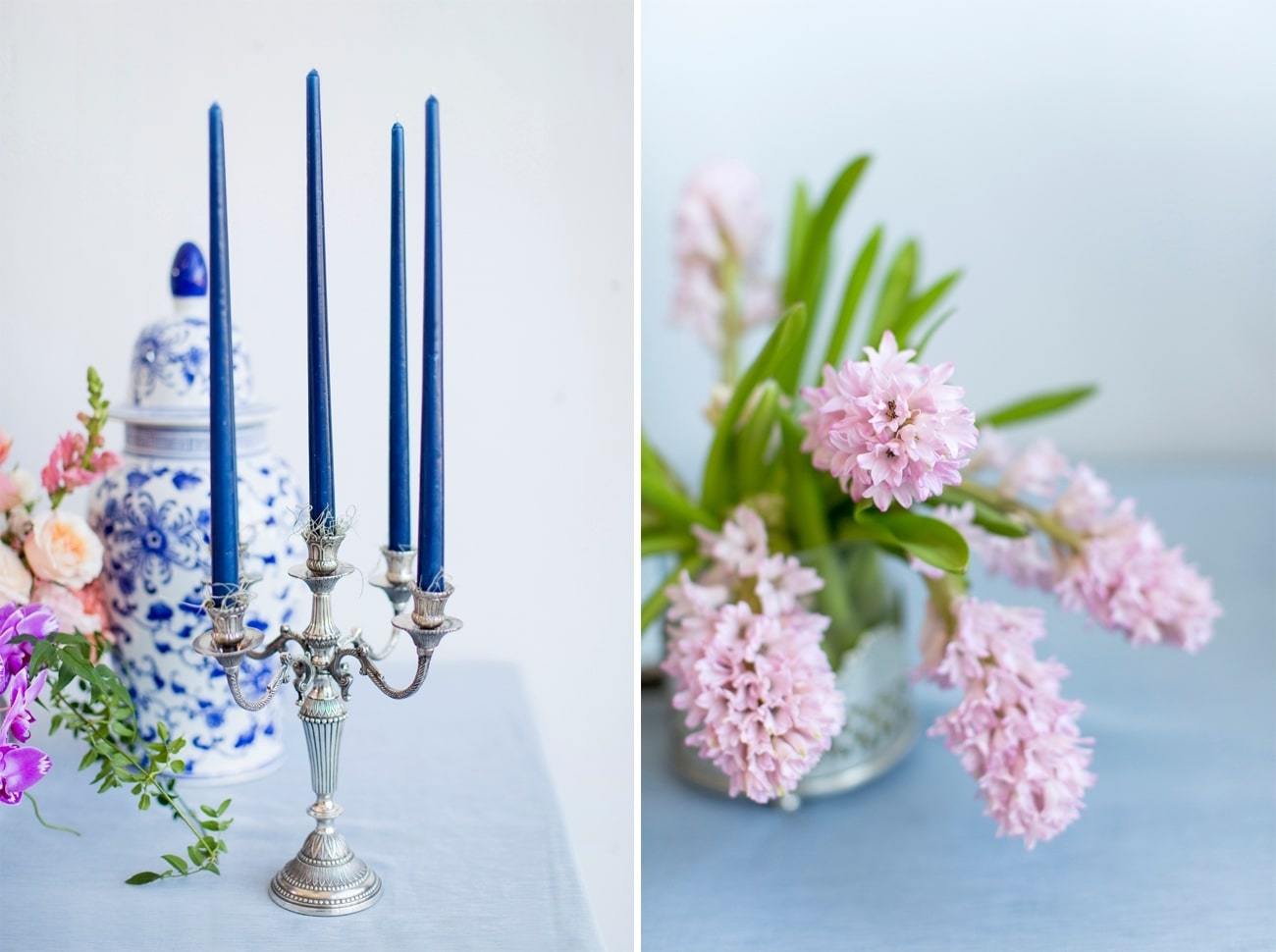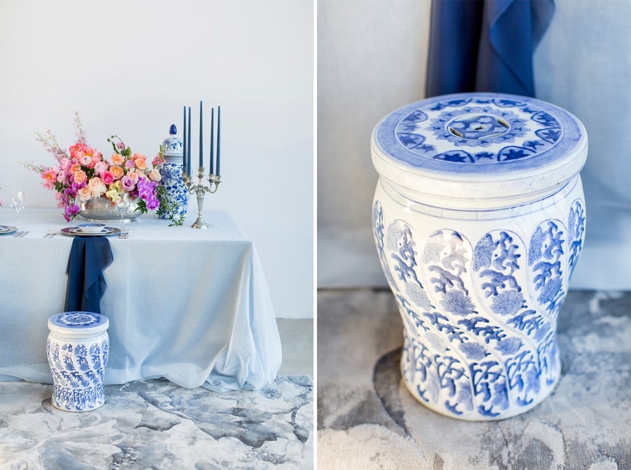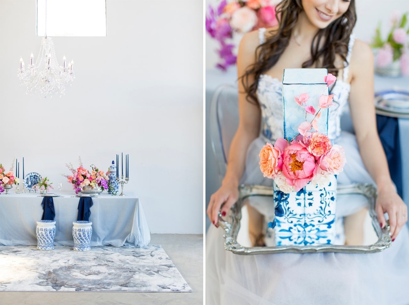 Our inspiration was creating a modern spin on an old fashioned theme and a look that was modern yet soft and romantic, with just a touch of vintage. The colour scheme we used was Delft blue, antique silver and shades of blush. Key elements included: Nederland and Chinese Delft, Victorian silver cutlery, brushed silver, navy blue candles and napkins, a sky blue tablecloth, Delft stools mixed with ghost chairs, and a floral carpet. We used flowers like orchids, peonies, hydrangea, and roses. The bodice of the dress, which was designed, made and hand-painted by Preez, was also Delft-inspired.