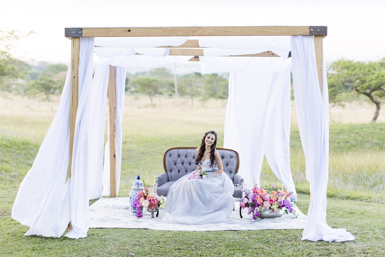 Photography: Marné Photography | Venue & styling: Whispering Thorns | Co-ordination: NOVA Events | Floral: LUSH Signature Floral Styling | Stationery: Design Bar Graphic Design Studio | Cake: Royal Treats | Dress: Preez | Accessories: Violet & Rose Jewellery Co. | Hair & makeup: Paintbrush Beauty | Linen & décor: Whispering Thorns | Rentals: Magic Function Hire (cabana) + Doug’s Hiring (chairs) + Curtain & Décor Shoppe (rug) | Model: Robyn van Staden