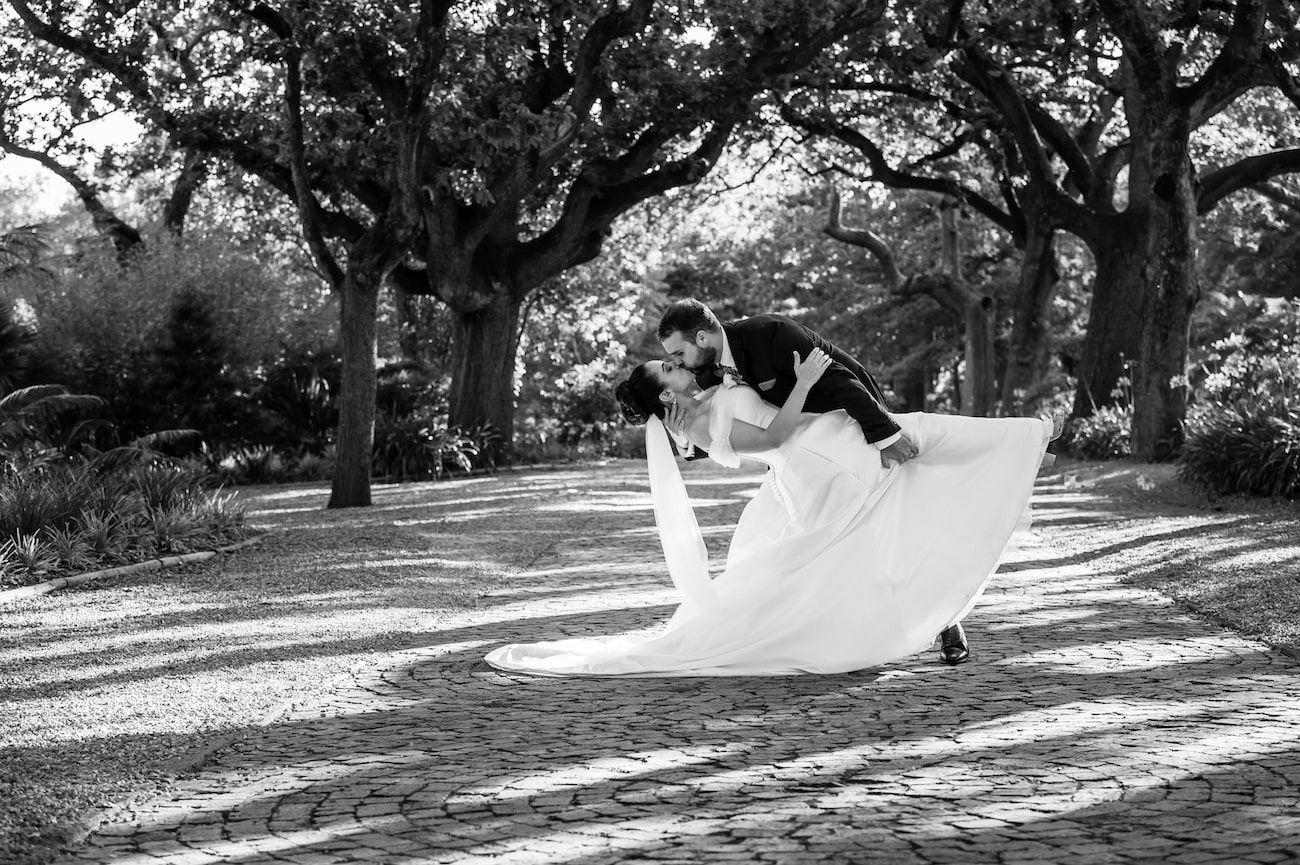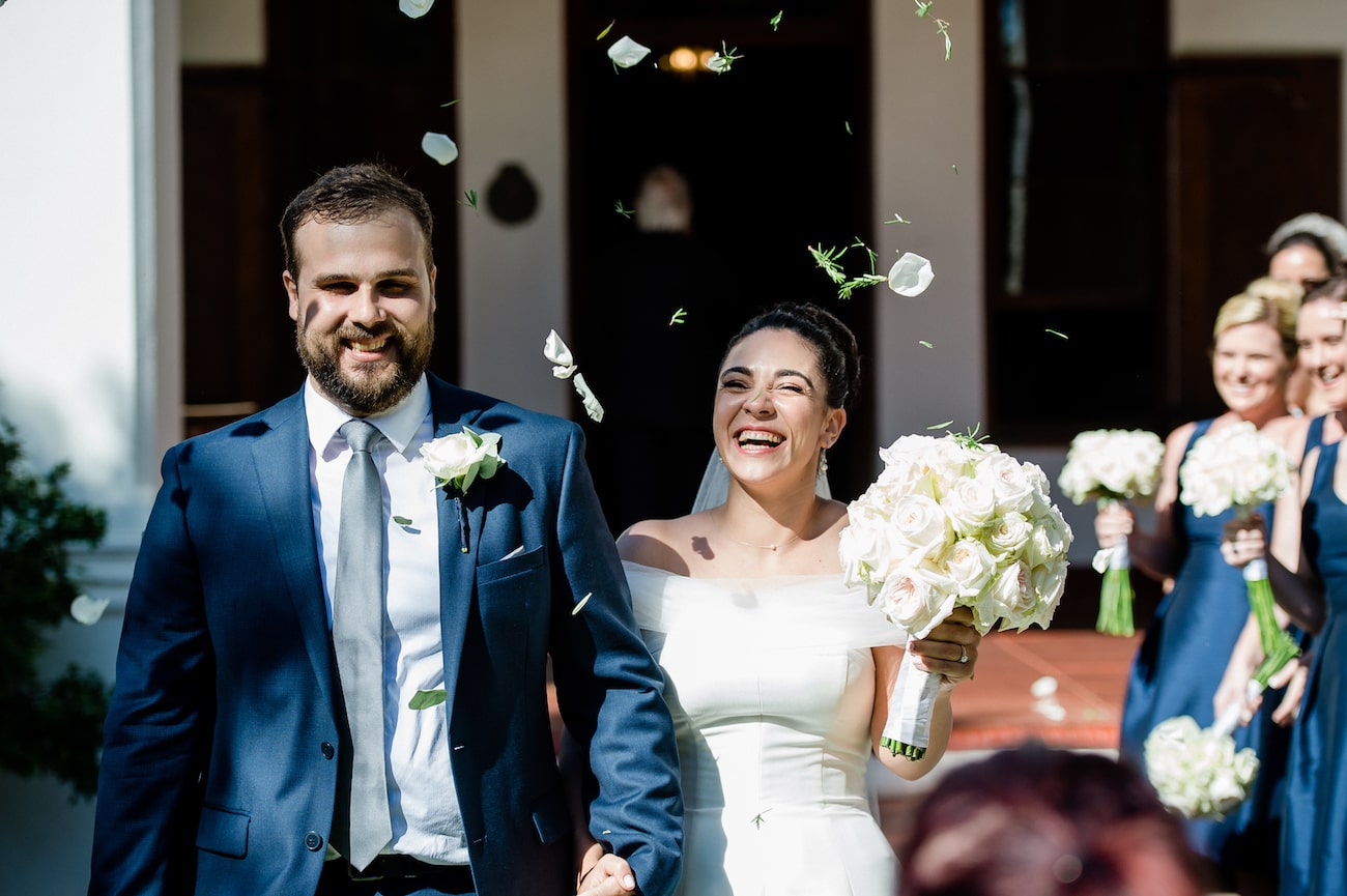 We’re both South African. Greg grew up in Cape Town and I studied there, and most of our two families live around the world, so we chose Cape Town – a great destination for everyone flying in (about 70% of our guestlist) which felt like home for us both. I knew I wanted a vineyard wedding and we visited ten venues in Stellenbosch across two days with our two moms in tow. Nooitgedacht was my favourite by far – elegant and unfussy, historic but not stuffy. I was especially in love with the idea of an outdoor ceremony and the brick lane under the arch of trees was just staggeringly beautiful. Even before I’d seen it, researching it from the US, I knew it was the one – but you have to do your research! I also loved that the name kind of reflected our story – when we started, I never would have thought we would end up at the altar so it felt like kismet. My favorite photos of us from the day are ones that showcase the natural beauty at the venue.