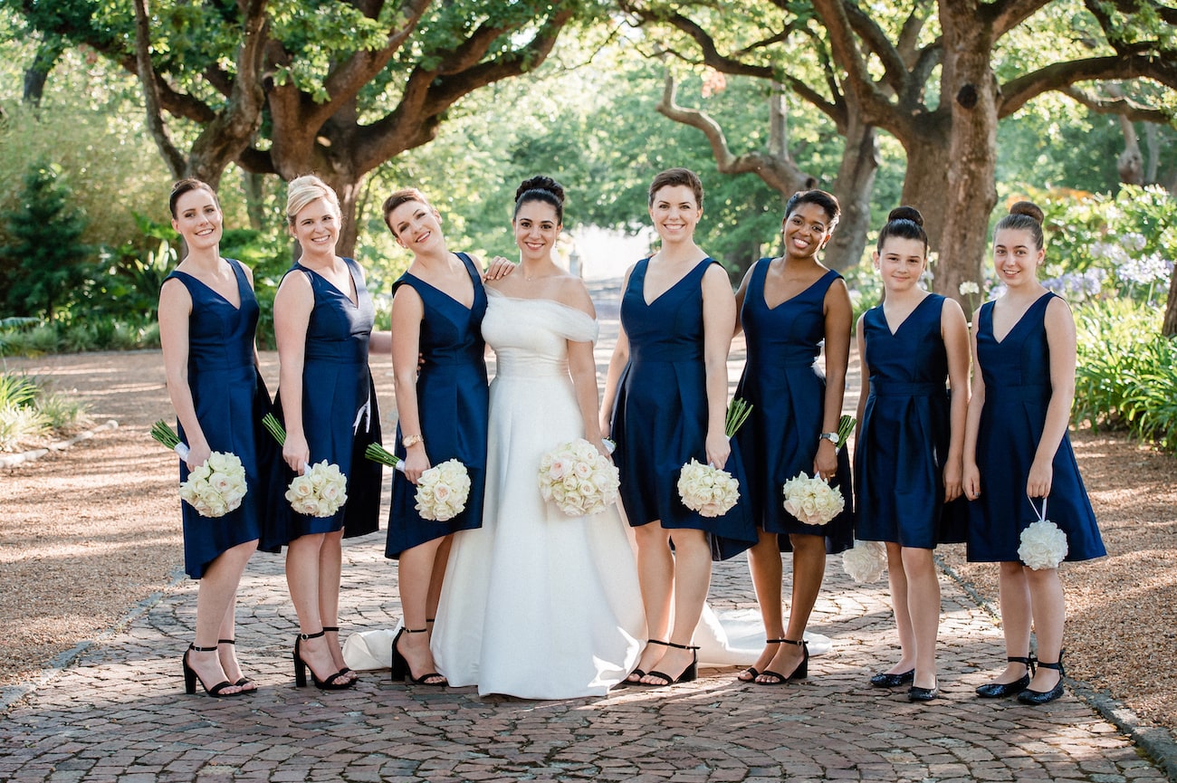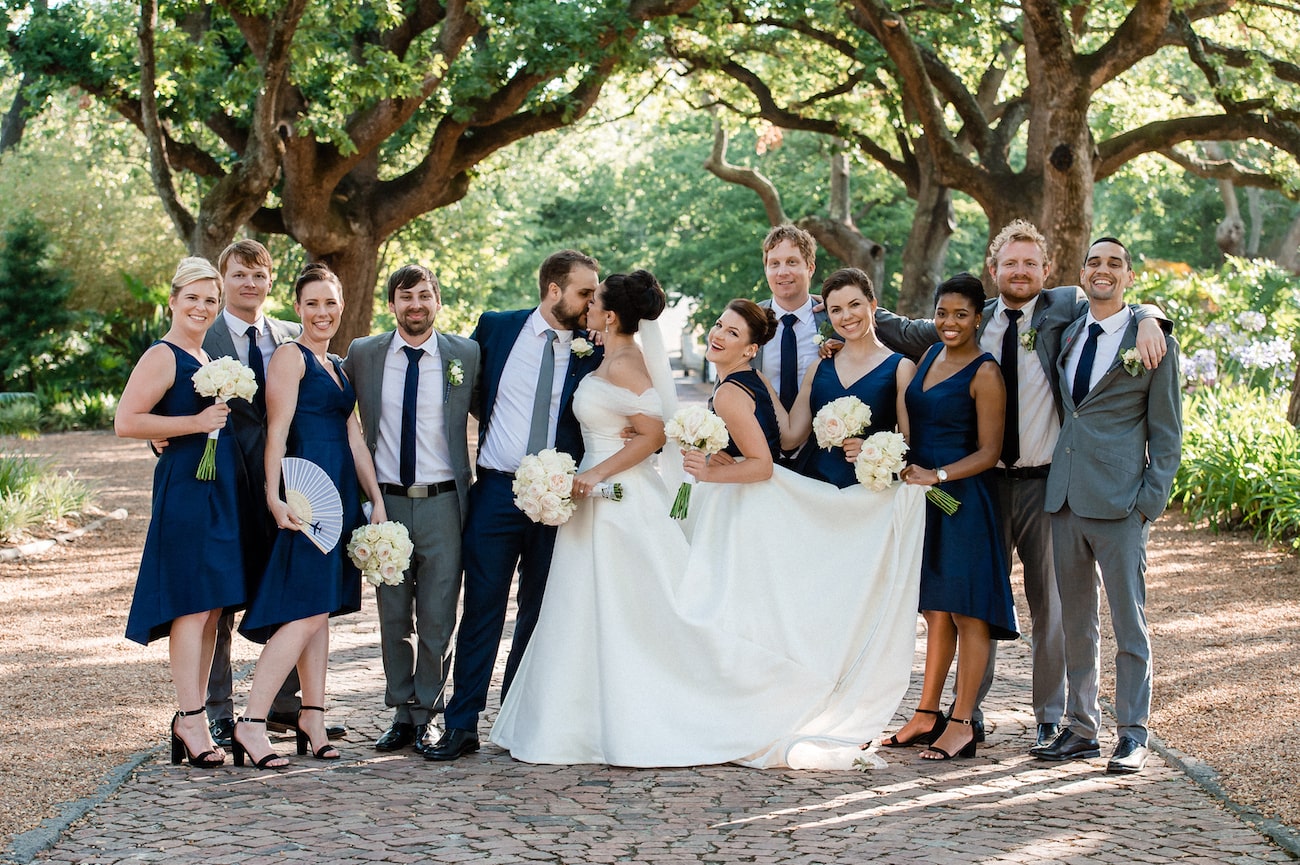 Venue & catering: Nooitgedacht Estate | Photography: Art Photo | Coordination: Withheld | Flowers & décor: N Concepts & Designs | Stationery: Brazzlebird | Video: White Lines | Cake: Cakes By Wade | Bride’s dress: Alfred Angelo | Shoes: Call It Spring | Hair & makeup: Corle Barnard | Bridesmaids’ dresses: Alfred Sung at Dessy | Groom’s suit: Calvin Klein | Groomsmen’s suits: Eurosuit | DJ: DJ Dean