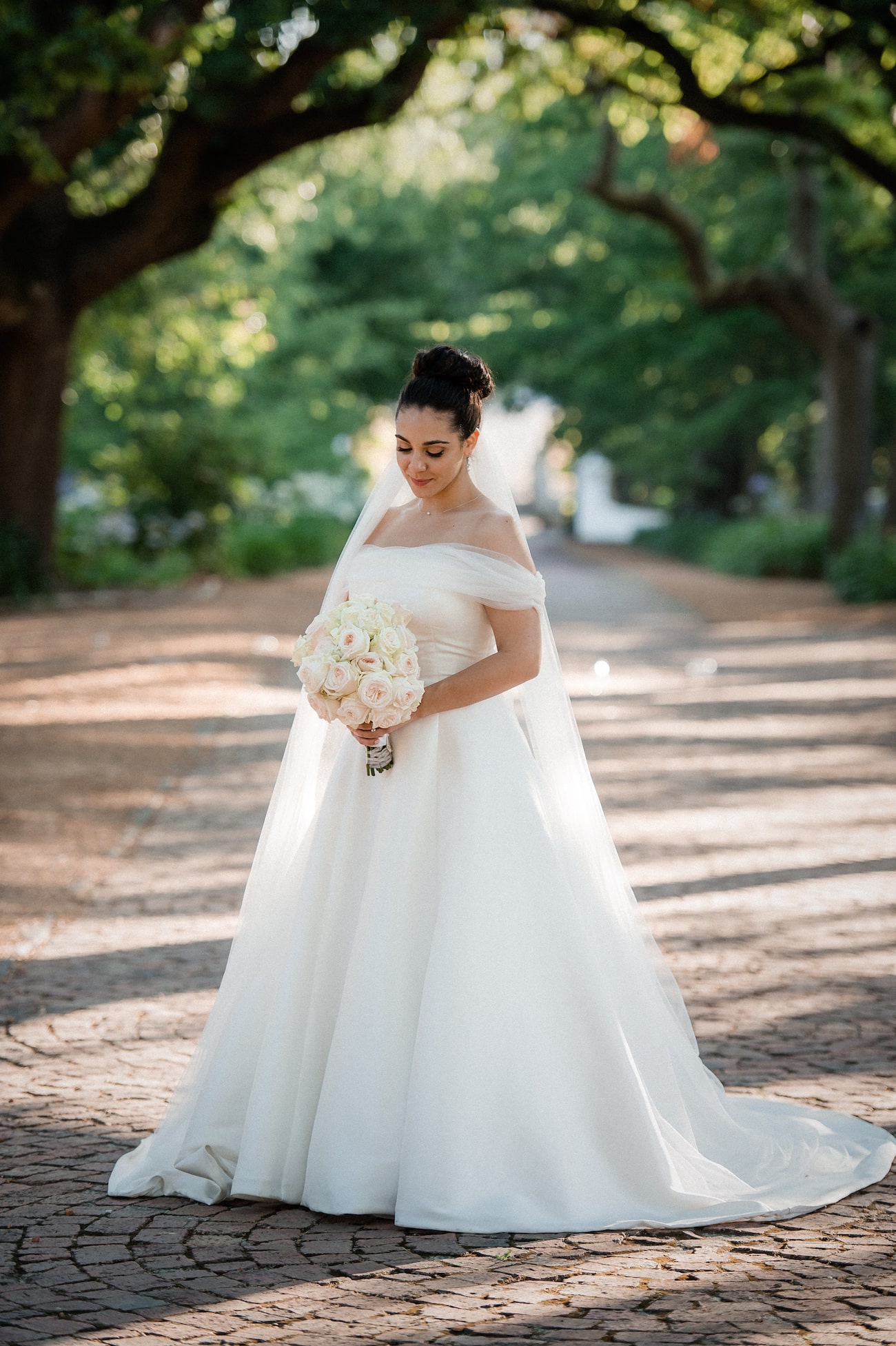 My favorite flowers are peonies but the logistics of the drought in Cape Town and the seasons not being right meant I had to find alternatives that were sustainable. I just wanted the same feel – large, round petal flowers in white surrounded by lush greenery runners – especially pennygum. For my bridesmaids and I, I wanted classic, round white rose bouquets – and the junior bridesmaids carried white rose flower balls.