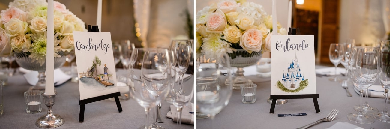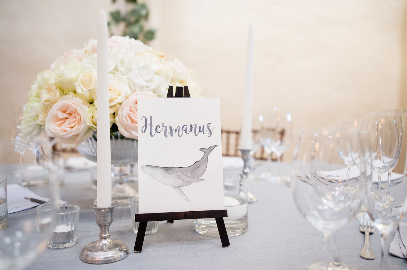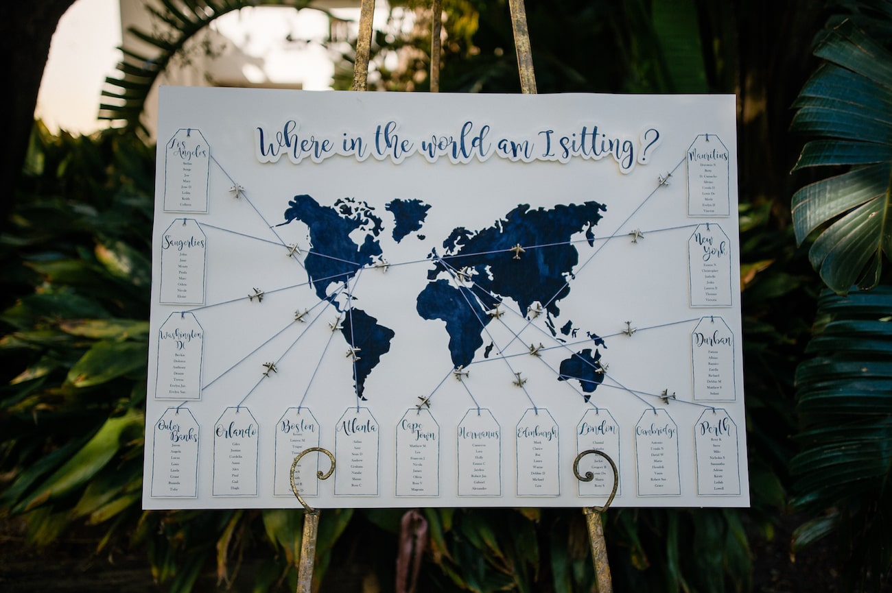 I’m very hands-on and a bit of a perfectionist so there were a lot of things that I wanted done just right. The biggest undertaking was hand-painting all of our wedding stationery, from the welcome sign and signature cocktail menu to our seating chart and tables names and place cards. I was painting up until the day before the wedding! My mom was incredible helping me to assemble all of the signs – most had 3D elements – where the images had to be stuck on thick double-sided tape to make them stand out, and threading all of the seating chart countries to their table tags! I absolutely loved doing it and it inspired me to start my own Etsy store creating custom art for other brides too! My father and husband dutifully folded, stuffed and labeled 90 ‘For Happy Tears’ tissue boxes, and attached ribbons, hearts and airplanes to over 100 silk fans. I also hand embroidered handkerchiefs for my husband and our parents to use on the day with personal messages from me. In a way, even my dress and veil were DIY – my mum, my gran and my gran’s sister (all exceptional seamstresses) handmade my veil and adorned it with hundreds of tiny pearls, and added the soft tulle collar that finished off my wedding dress. Every element was made with love.