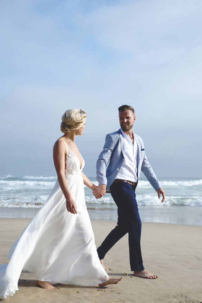 I could use a little beachiness today, to remind me of summer, and this bijoux Garden Route wedding really fits the bill. Infused with sunshine and salty air, Tarryn and Warwick’s ceremony overlooking Noetzie Beach was the first part of their wedding celebrations (with part 2 being a reception at a local wine estate), and it exemplified everything I love about intimate weddings. There’s an incredible feeling of warmth and family and togetherness, exemplified by the way that, at the dinner that followed, each guest made a heartfelt (and tearful!) speech. Tarryn’s dreamy Silver Swallow gown and gold laurel headpiece and Warwick’s pastel blazer were the perfect complement to their laid back wedding style, and that beautiful simplicity carried through to the dinner decor of hanging bunches of fynbos and greenery garlands interspersed with candles – all at a table with the most incredible view of the sea. Alfred Lor was on hand to capture all the natural beauty of this special day.