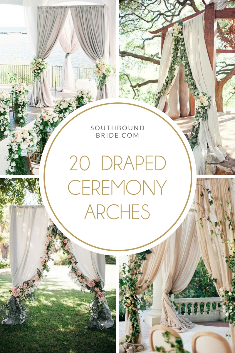 Dreaming of an outdoor ceremony? Then you are going to adore today’s inspiration roundup. Romantically draped arches are such dreamy decor elements. Cascading, sheer fabrics and ropes of gorgeous florals create the most exquisite backdrop for saying your “I dos”. Whether it’s a flutter of cotton draped over a simple wooden frame adorned with fragrant foliage, or a four poster canopy with layers of sheer fabric and a crystal chandelier, there are many ways to style an unforgettable ceremonial arch. Take note of this lovelies, draped arches aren’t limited to the altar area so why not create a fabulous draped entrance or even a series of arches down the aisle?