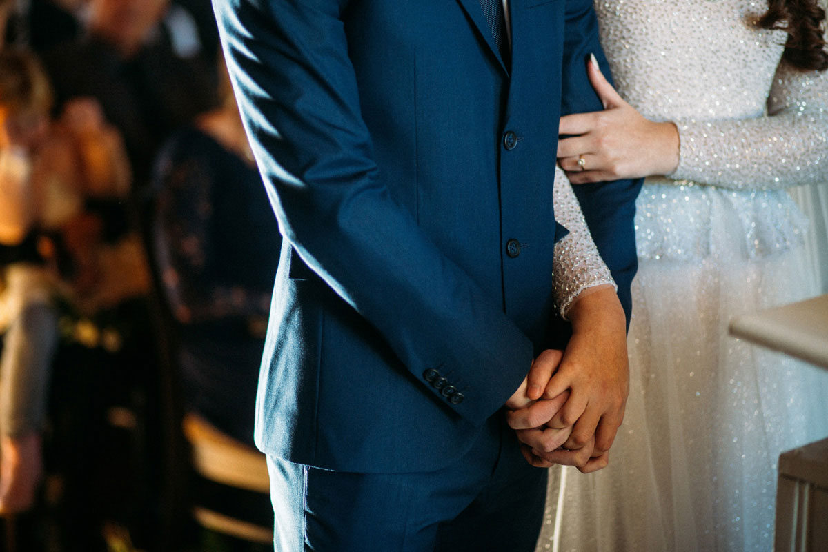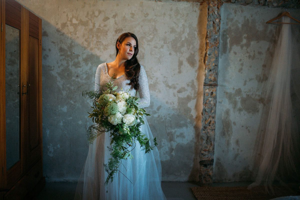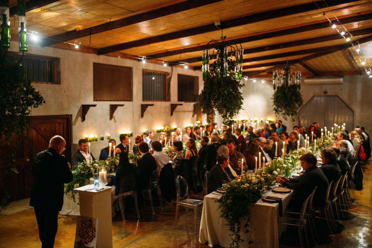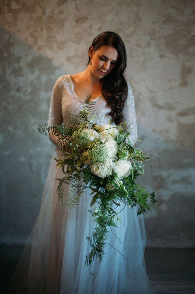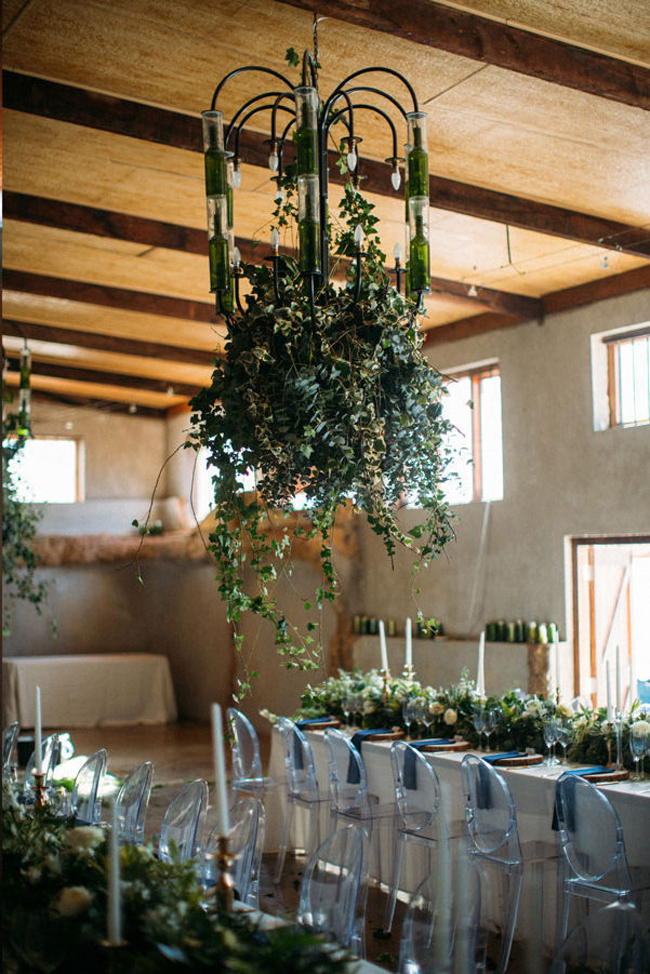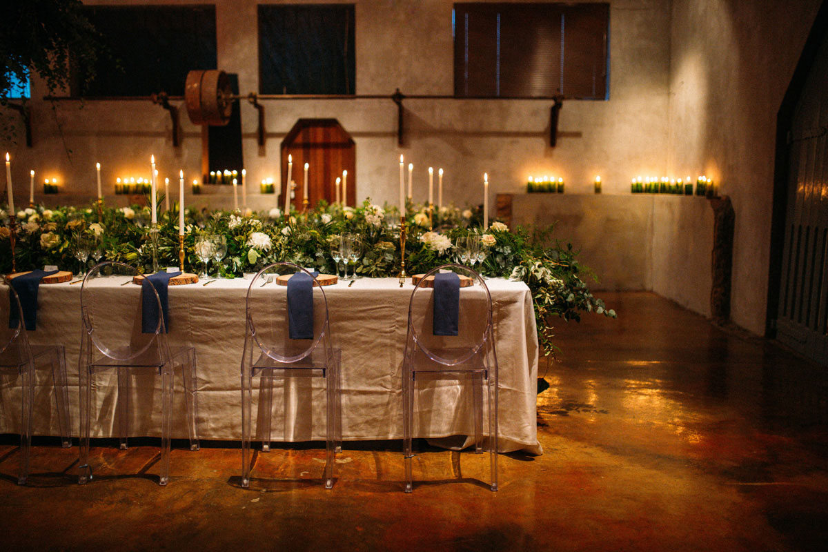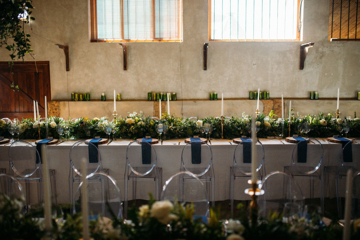When it comes to fashion magic, today’s bride takes the biscuit! One look at her showstopping sparkle-bodiced Janita Toerien gown and you’ll see exactly what I mean. It is perfection, and Nicole rocks it with vintagey sideswept hair and an oversized greenery and white statement bouquet. And that’s just the first part of what we love, because Nicole and Divan, a pair of high school sweethearts who tied the knot at beautiful Leipzig Country House, threw an atmospheric celebration overflowing with pretty. From soft candlelight bouncing off rustic walls to greenery chandeliers, to bridesmaids in elegant navy lace, to Moira West ‘s absolutely SWOONY pics, it’s enchantment at every turn.