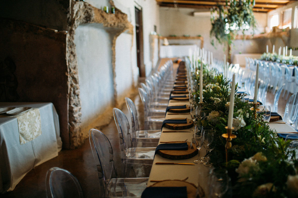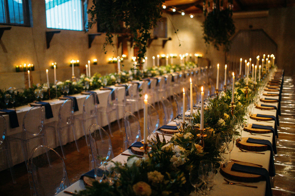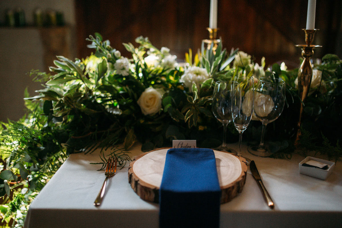 The flowers were the thing I stressed about most and they turned out absolutely perfectly. I wanted a lot of greenery with a few added white flowers. The flowers on the tables were made as runners, and we had greenery hanging from the chandeliers in the reception hall, which just enhanced the ‘forest’ look.