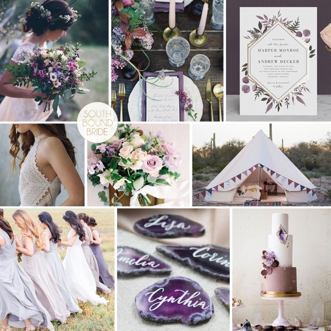 Row 3: Bridesmaids in purple tones (Reverie Supply/For Her and For Him) | Agate slice place cards (Golden Hour Paper Co.) | Cake with geode detail (Chaz Cruz Photographers/Diana Lin/Silk Cakes)