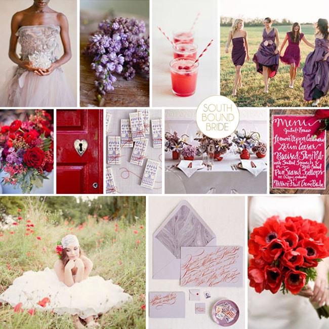 Top row (l-r): Top row (l-r): Lilac dress {Elizabeth Messina/Joy Adaeze}; lilacs; red cocktails {Vanilla Bean Blog}; bridesmaids {Elizabeth Messina}