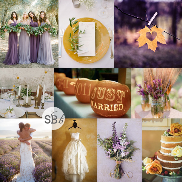 Happy Monday friends! As part of our month of autumn awesome, over the next few weeks we’ll be focusing our colour inspiration on Pantone’s Fall 2015 palette (be sure to check in this afternoon, when we’ll be introducing all the colours and pairing them up with gorgeous bridesmaid dresses). Today we’re starting with a combination of mustardy yellow and bright violet shades – absolutely perfect for a warm but very pretty autumn wedding. Add touches of soft purple and pumpkin shell orange to round it out, and you have a beautiful seasonal look.