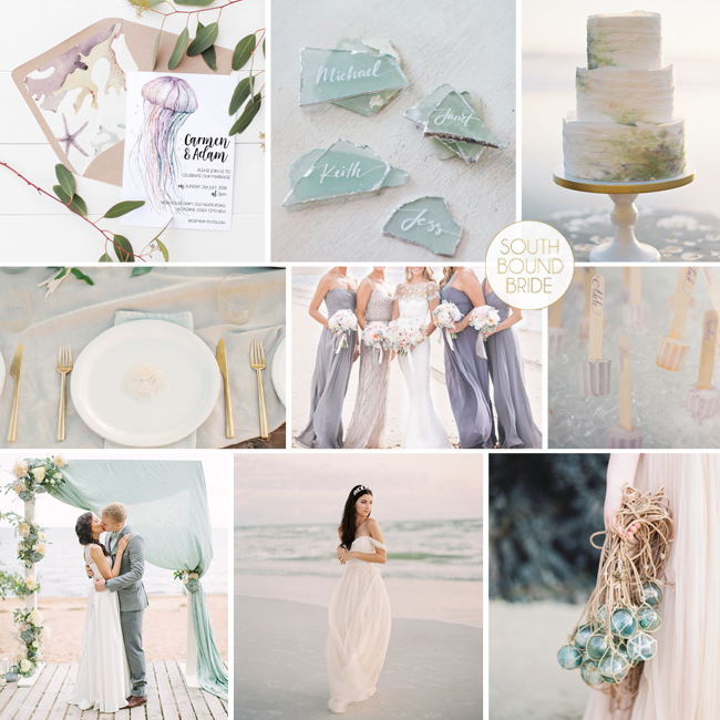 When it comes to beach weddings, some colour schemes pop up over and over again – usually variations on the ocean colours of blue and green. Nothing wrong with that – I’m always a big fan of everything in the blue-grey spectrum! But you don’t need to limit yourself if you’re yearning for a coastal celebration but attracted to some of the other colours of the rainbow. Today I thought I would bring together a soft seaglass green with pale lavender and a touch of peachy blush, and I have to tell you, I love it! What do you think? This post includes affiliate links (in bold); SBB may receive a commission on any sales but the cost to you remains the same.