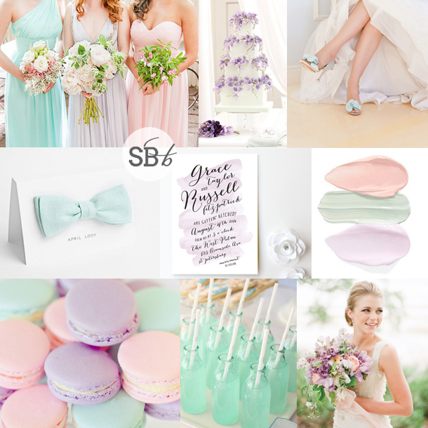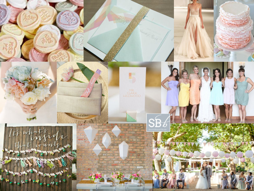 Pastel lovers, get ready, because today is your lucky day. I’ve really liked the ice cream pastels that have merrily floated their way into weddings in the last year or two – so pretty! Especially with mismatched pastel bridesmaids. This is a look that many brides have combined with a vintage (and sometimes rustic) look – baby’s breath bouquets, vintage books tied with lace, proteas, you know the drill. So today I wanted to reinvent the colour palette for modern romantic brides and grooms. A bit of a geometric detailing, a tiny touch of sparkle, and here you go. I think I have a new style crush :)