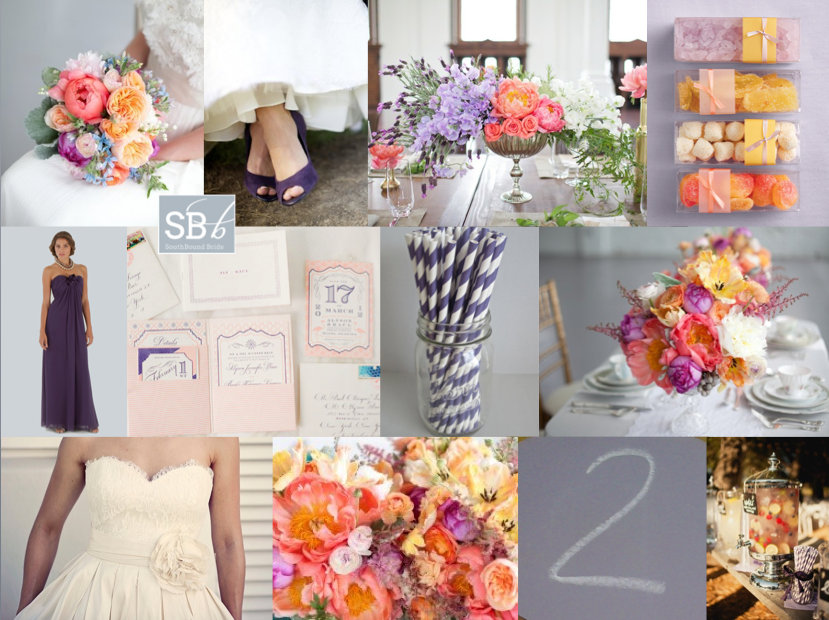Never let it be said that I don’t love my readers! I know how sometimes planning can be overwhelming (especially bringing all your ideas together as the big day approaches), so when I got a wedding 911 from SouthBound Bride Stephanie, I put together this little board for her quick sharp. Stephanie had chosen a lovely deep purple as her main colour, with beautiful bridesmaid dresses for her girls. However, Stephanie was also in love with colour and fun, but was having a tough time convincing everyone else involved with her wedding that she could be vibrant and still classic and beautiful. Her dream palette – purple combined with coral, yellow and pink – was certainly unusual, so I immediately started looking for florals in this combo. As I suggested to Stephanie, if you’re working with bright colours but you want to make sure they don’t become too much, the best thing to do is keep everything else simple and let the flowers really pop. Because flowers are colours from nature, they have natural tones to them, so you don’t get the same hard colour block effect that you might with something synthetic. It’s a softer and more classic look. Luckily I didn’t have to look too long before I found the perfect inspiration shoot, and all I can say is WOW. Isn’t this palette stunning? I’m such a convert. Paired with simple place settings and classic stationery, the florals really do the talking (and they say “hello, I’m gorgeous”). You’ll notice there are a lot of peonies in the board – and yes, peonies are incredible, but they’re also hard for a South African bride to find. However, chat to your florist about other options, as there are many lush colourful flowers (ranunculus or carnations, for example) that will do a great job here. Another tip I gave Stephanie was not to try to bring all four colours into everything – combine two here, two there, and the result is cumulative.