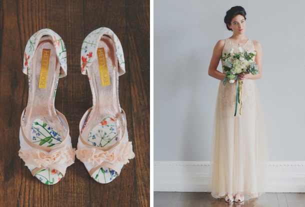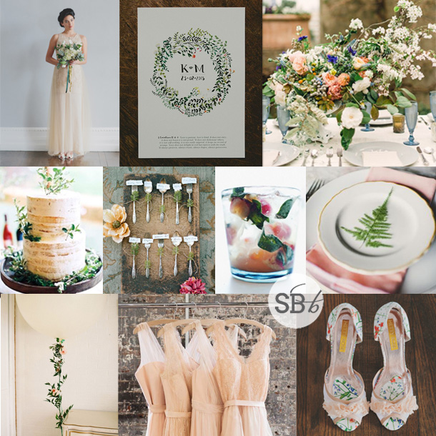 Happy Monday, lovelies! When I was putting together last week’s post on the Etsy Wedding Fair, I just fell in love with the gorgeous Liberty print shoes by Hetty Rose, and I thought how amazing they would be for a botanical wedding, which got me all inspired to create a new botanical inspiration board. I really love the unusual colour scheme I’ve ended up with – the soft vintagey peach and off whites, with tiny punches of orange, red, coral and blue. In larger colour blocks, they’d be overpowering, but here they have a lovely, mismatched but pulled together feeling. I’m especially loving the flowers in the image top right and the flower wrapped oversize balloon, and the cutlery escort cards – those little details that catch the eye and spark the imagination. Fun!