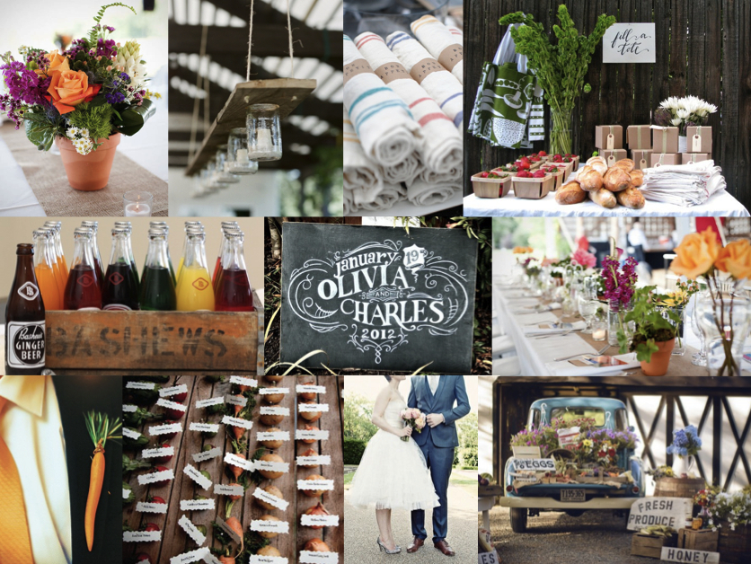 Hello friends! How are you enjoying your Tuesday? Where I am (in Durban) it’s raining like mad… hm, time to head for the English summer again, I think. ;) Big thanks to all of you for the blog, facebook, twitter and email love for the new site – very, very much appreciated! This afternoon I have a fun little inspiration board for you, which was created especially for one of our featured brides whose sister is now taking the plunge. The plan is to have a sort of market feeling, celebrating ‘the abundance of life’. Guests will get to serve themselves from an amazing spread of market-style food – how fun is that? I just love this idea, and I was pleased to find that farmer’s market-style weddings are a growing trend across the pond. There are so many cute things you can do here, and you all already know how much I love including fruit and vegetables in your decor. So here’s my take, using bright colours and rustic natural textures. Mason jar lights are perfect here, as are the adorable vegetable escort cards (and a carrot as a boutonniere? why not?!), kraft paper and chalkboard details, and Bashews soft drinks. I love the idea of creating a whole market display, especially when guests are given brown paper boxes or tote bags, and able to take home produce as their favours. Flowers are mixed and natural, and I like the mix of little jars and potted arrangements. I can just imagine the bride wearing a pretty short dress, like the one shown here – so fun! Hope your sister likes this, Kerri – keep us posted!