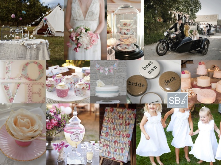 Good morning friends! Today we’re all about pretty country shabby chic style, starting with this inspiration board (and come back later for something extra special!). This is actually a look I’ve seen quite a bit recently in the UK. It’s a really pretty alternative to the vintage look that was everywhere in SA this season, and is all about pastels and mixed floral fabrics (in this case inspired by Cath Kidston style). This board is a request from one of our lovely readers, Jenny, who is getting married in her local church and travelling on to the reception (in a tented marquee in a field) on a motorbike and sidecar – so cute! She’s made loads of bunting using Cath Kidston fabric, and will be serving sandwiches, pastries and cakes at their tea party. It reminds me of a village fete, and Jenny could even consider having some of the games and entertainment you find at a fete – tombola stalls, hay rides, etc. I really like the idea of having a cake table with lots of different cakes and labels for each of them, just as if they were a baking competition, instead of one cake. She could even use Cath Kidston cupcake cases to tie in with her bunting. Other Kidston touches that I love are the mini cake bunting, the escort card board, and the LOVE letters (you could also make these yourself into table numbers). Carry a beautiful rose bouquet (I’m in love with this one, which has a slightly wild, natural touch). Teacups should be a big part of the decor – collect random ones on eBay and place them at each table setting with a rose inside – this doubles as a favour. Another cute favour is the little button badges, which are just adorable. You could also pile teacups up under bell jars or hang them at different levels from the ceiling. Serve a range of teas, as well as lemonade (or better yet, this marital bliss special cocktail) and consider hiring in a specialist coffee machine – I’ve seen how popular these are! Hope you like your board Jenny – good luck with the rest of your planning!