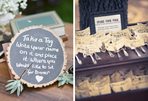 • Allow plenty of time: My friends allowed guests to wander into the reception area to choose their spots during cocktail hour, which gave plenty of time and avoided a mad rush. One idea is to provide your guests with name tags or escort cards (or even forks, like in the adorable example above!), and suggest they place them where they’d like to sit (which also prevents your gorgeous reception space becoming overrun with placeholding bags and coats).