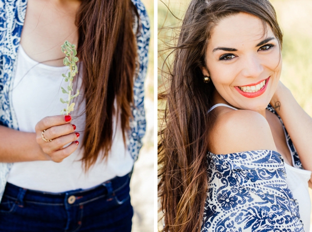 You might decide to do one or more outfit changes during your session, but a great way to achieve a variety of looks is by simple layering or changing up your accessories a bit. Plus, layers add depth through the camera lens, and interesting textures or shapes create a focal point for the eye. For example, in the pics below, I love how the bride-to-be has popped a gorgeous patterned jacket over a simple top, and later in the post you’ll see how a hat can add an extra little something something to a relatively simple outfit. Sparkle is another thing that photographs well. But as with the props, if it’s not YOU, don’t do it. You’ll almost never find me in a hat, so wearing one in a shoot would just be weird for me. Now a scarf or a chunky necklace, on the other hand… ;) On the other side of the coin, there are some don’ts: tiny, busy prints, thin lines, and very loud prints all look pretty rubbish on film.