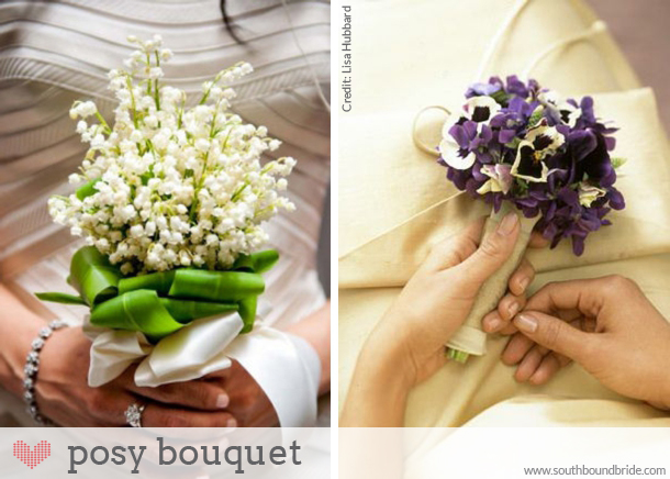 The smallest bouquet type, posy bouquets are often used for flowergirls or bridesmaids, or casual brides (they’re great for a relaxed second wedding, for example). They’re made similarly to nosegays; the key difference is in size. Kate Moss carried one for her wedding to Jamie Hince.