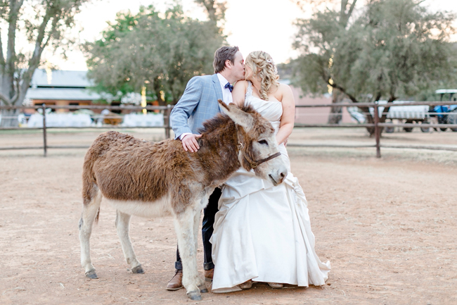 There’s something special about home weddings – they have such a sense of warmth and comfort and happiness about them, and I love picturing the couple returning time and again over the years and always thinking of their special day, and how this tree is the one they got married under and that spot is where the marquee was, or whatever it is. Today’s home-on-the-farm wedding is all that and more, because it also includes a very personal theme, perfect not just for the Karoo stud farm location, but for the horse-mad bride and groom. As well as getting married in a paddock, having their reception at the stables, and having plenty of their four-legged friends included as part of the day, Alex and Jess opted to include sweet equestrian elements in their decor, from horse shoe escort cards, to rosette table numbers, to tack and trophies on the tables, to ‘grass’ centrepieces. So fun, and so personal. And I can’t not mention Jess’ blushing bride bouquet, or the blushing bride-bedecked cake! My FAVE. Christine Joy took these lovely pictures that really capture all the down-home fun and happiness.