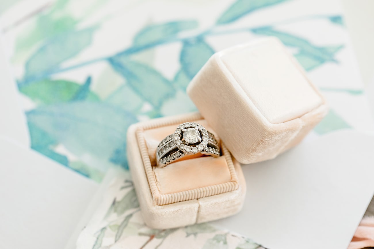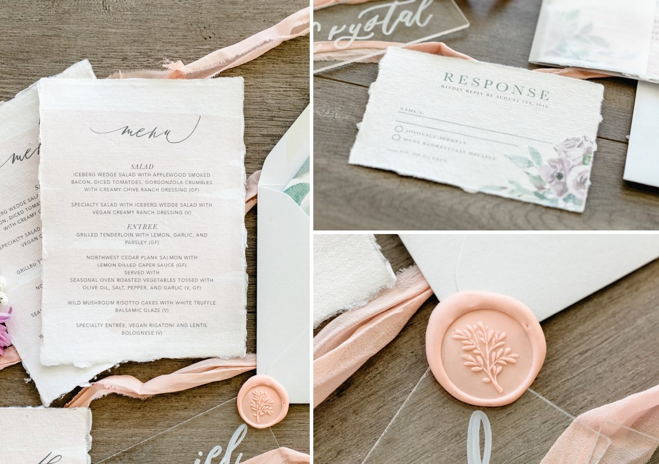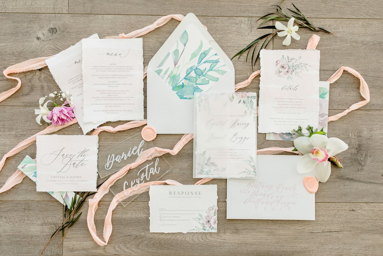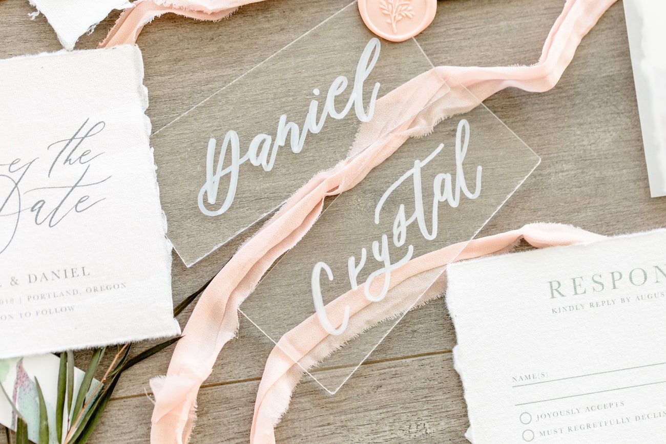 If there’s one thing that never fails to inspire me when it comes to weddings, it’s beautiful colours and unique combinations of hues. Which is why today’s shoot made my little heart sing when I received it from a talented US team headed by Kara Taylor Photography and Peachy Keen Coordination . It was inspired by – believe it or not – a suit. A suit in a gorgeous shade called Osprey Blue (isn’t that a wonderful name for a colour?), which combines stunningly with a very soft peachy coral (love this as a soft wedding-friendly alternative to Pantone’s new Colour of the Year, Living Coral). The palette is perfectly complemented by series of soft, romantic details (hand lettered watercolour stationery, with transparent escorts as a modern touch), beautiful blooms, and light and airy images in a lofty neutral space. It’s just LOVELY. So let’s step in and enjoy it, shall we?