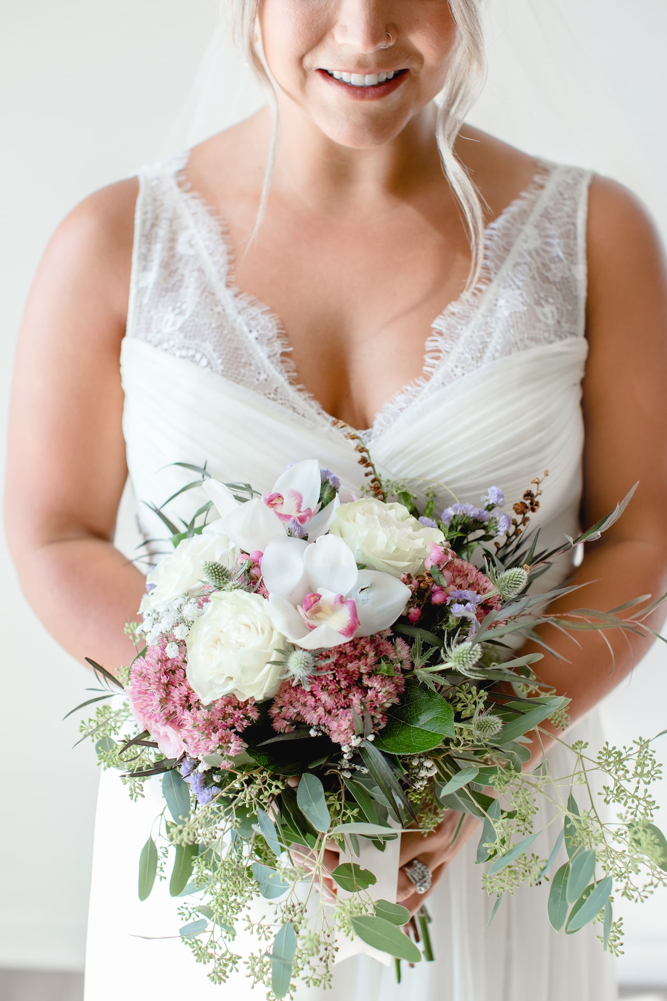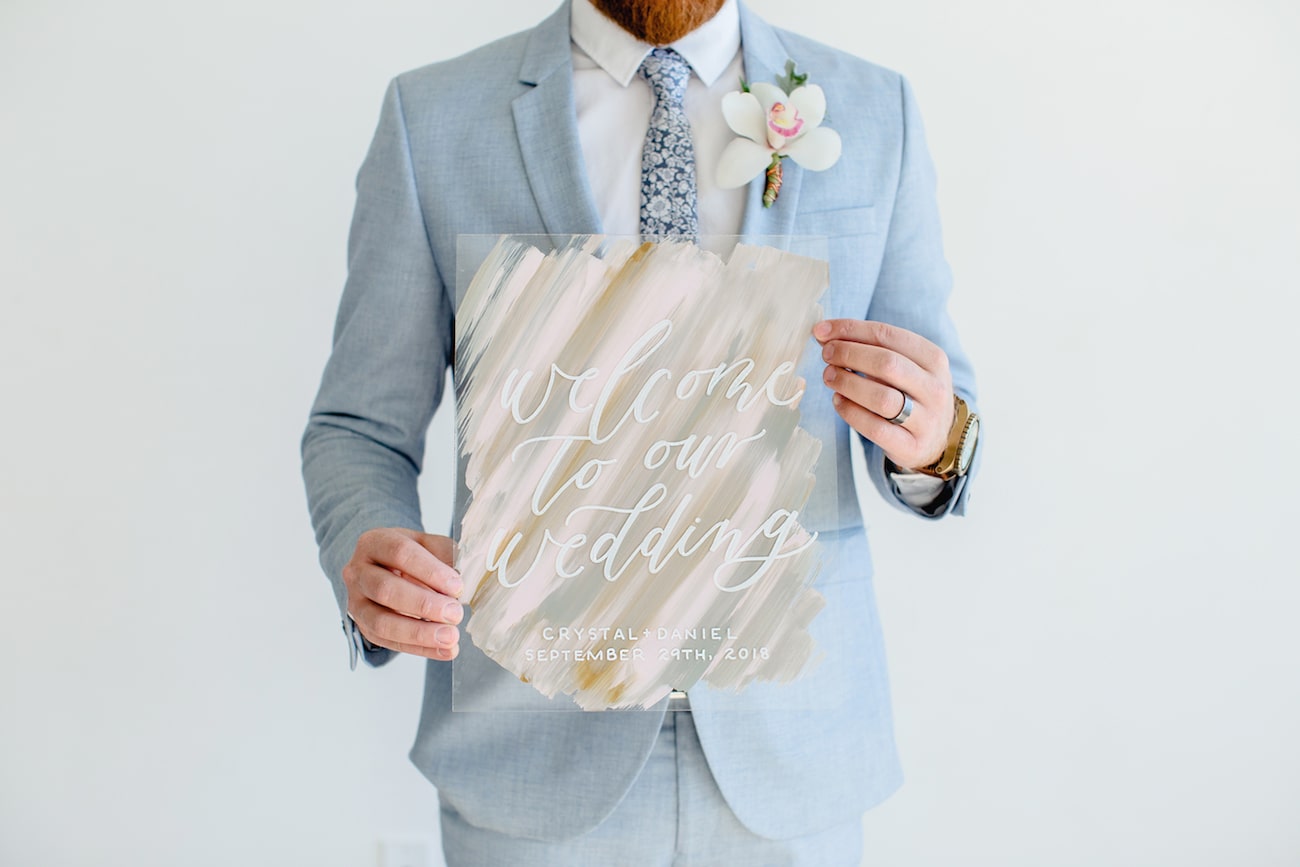 Our florist wanted to keep things pretty muted, but also wanted to add a couple of touches of colour into their pieces. By adding a couple orchids into the bouquet with a dreamy lavender contrast, it was modest yet eye catching. And we loved the detail of the twisted wire on the bout! We were in love with our acrylic signage created by Letters & Dust which featured the pastel colours with brush strokes to mesh them all together. Our miniature cake was also perfect for a couple to cut, complete with a sherbert orange that ombred down to a light brushed blush which perfectly contrasted with the groom’s suit.