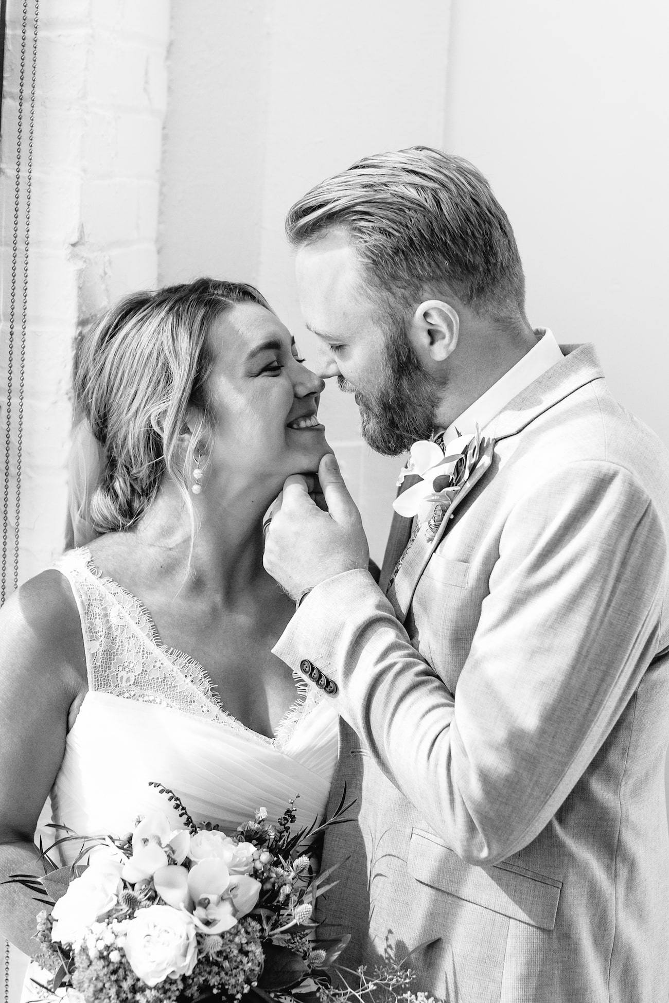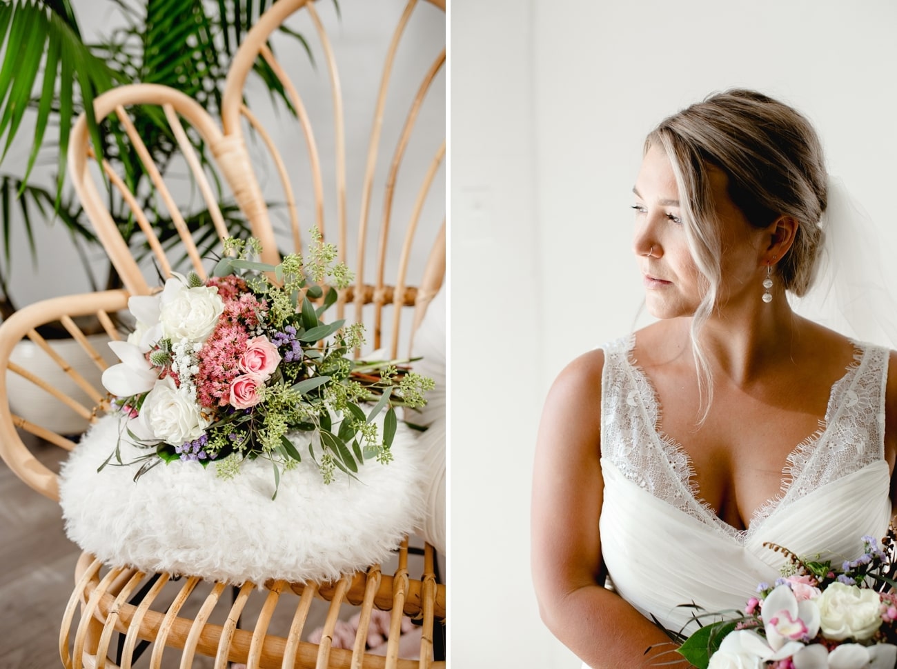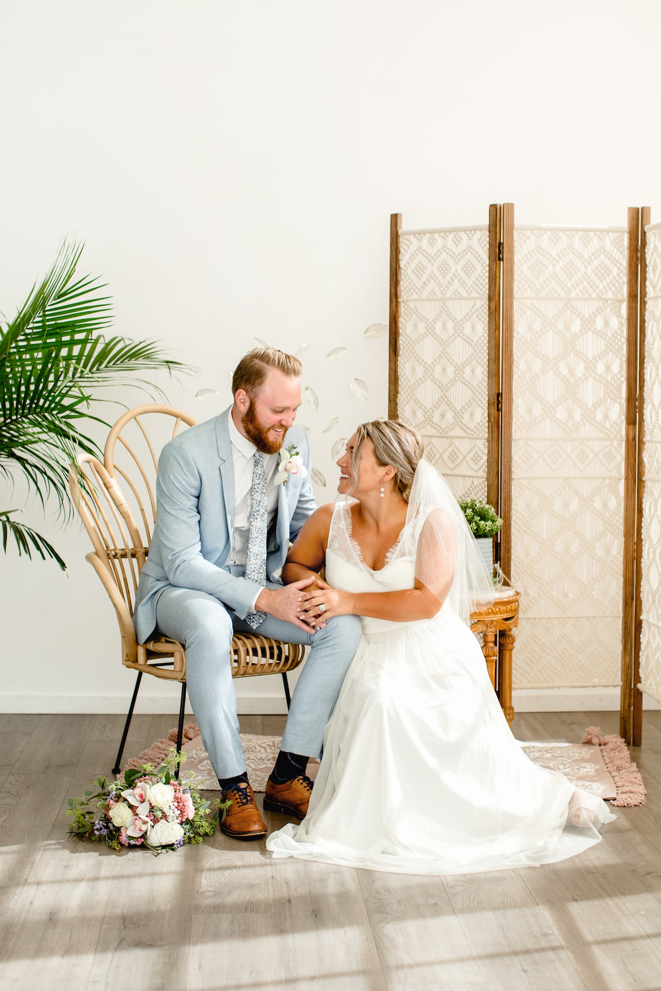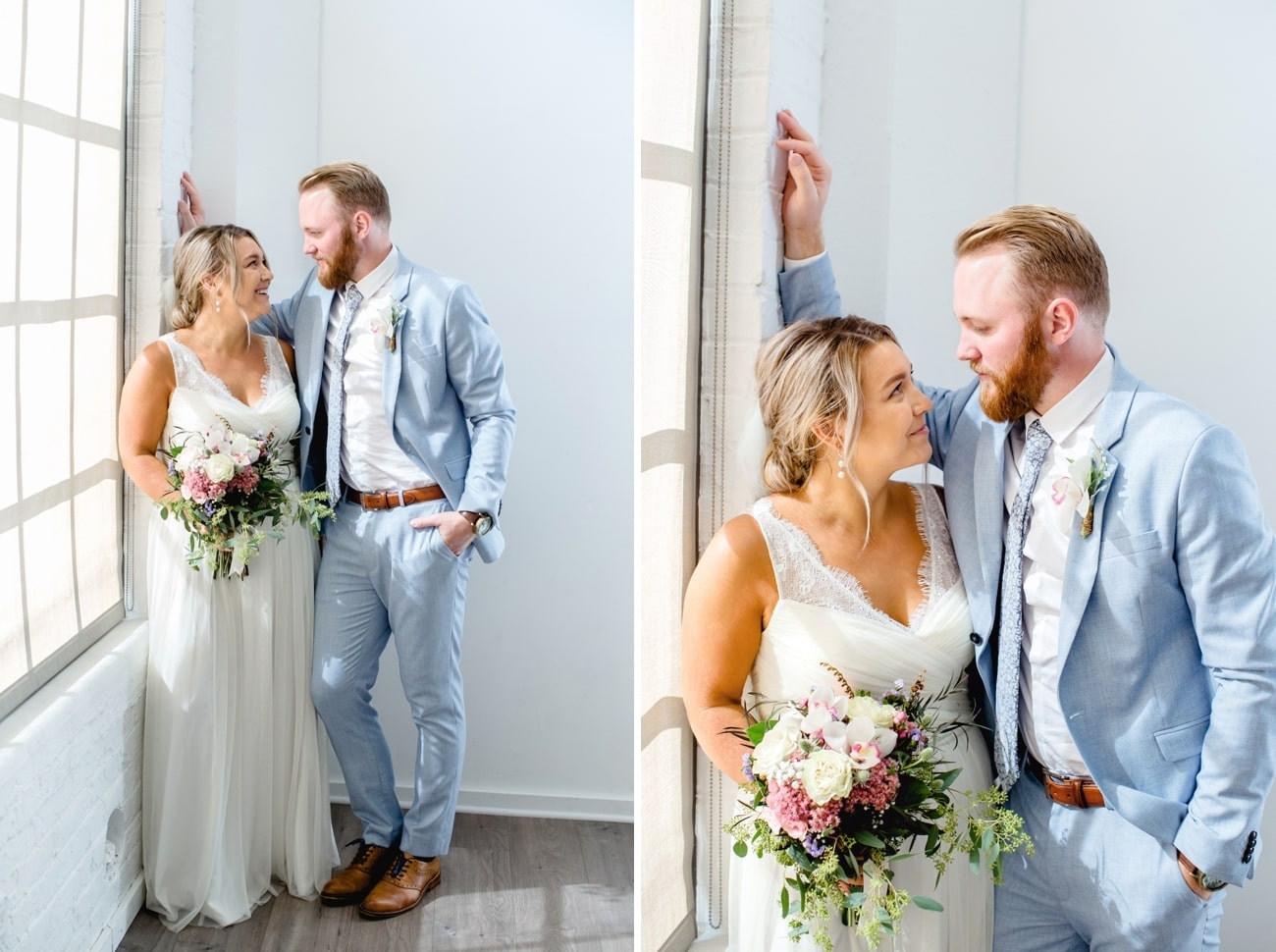 Our inspiration was based around the suit that our groom already owned (seriously, what a cool guy to own such a unique suit! He credits that to his wife!) We then pulled in other pastel elements that would still be able to pop with soft and airy photos. For our bride, we desired a soft, airy fabric so that her groom could spin her around the room and romantically dip her. Her veil even included soft pearl pink details which was carried through the rest of the gallery. The perfect early autumn day provided ideal natural light and even allowed us to play with shadows. We really decided to focus on the couple and their loving interaction!
