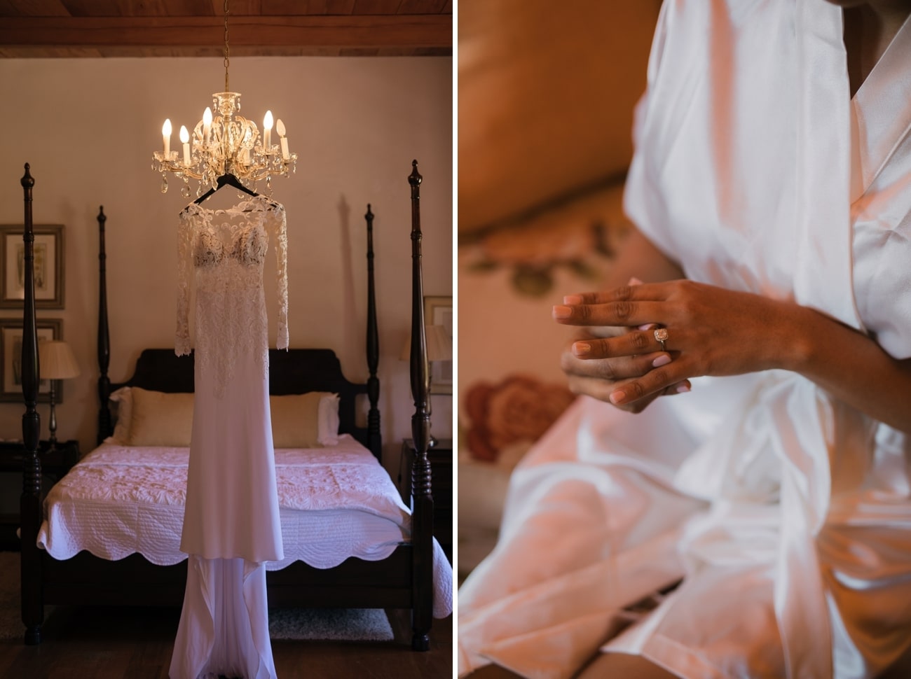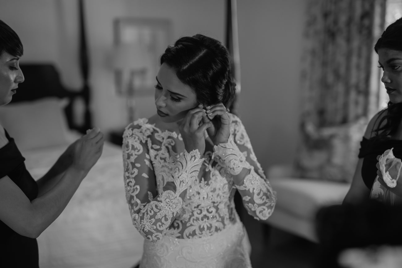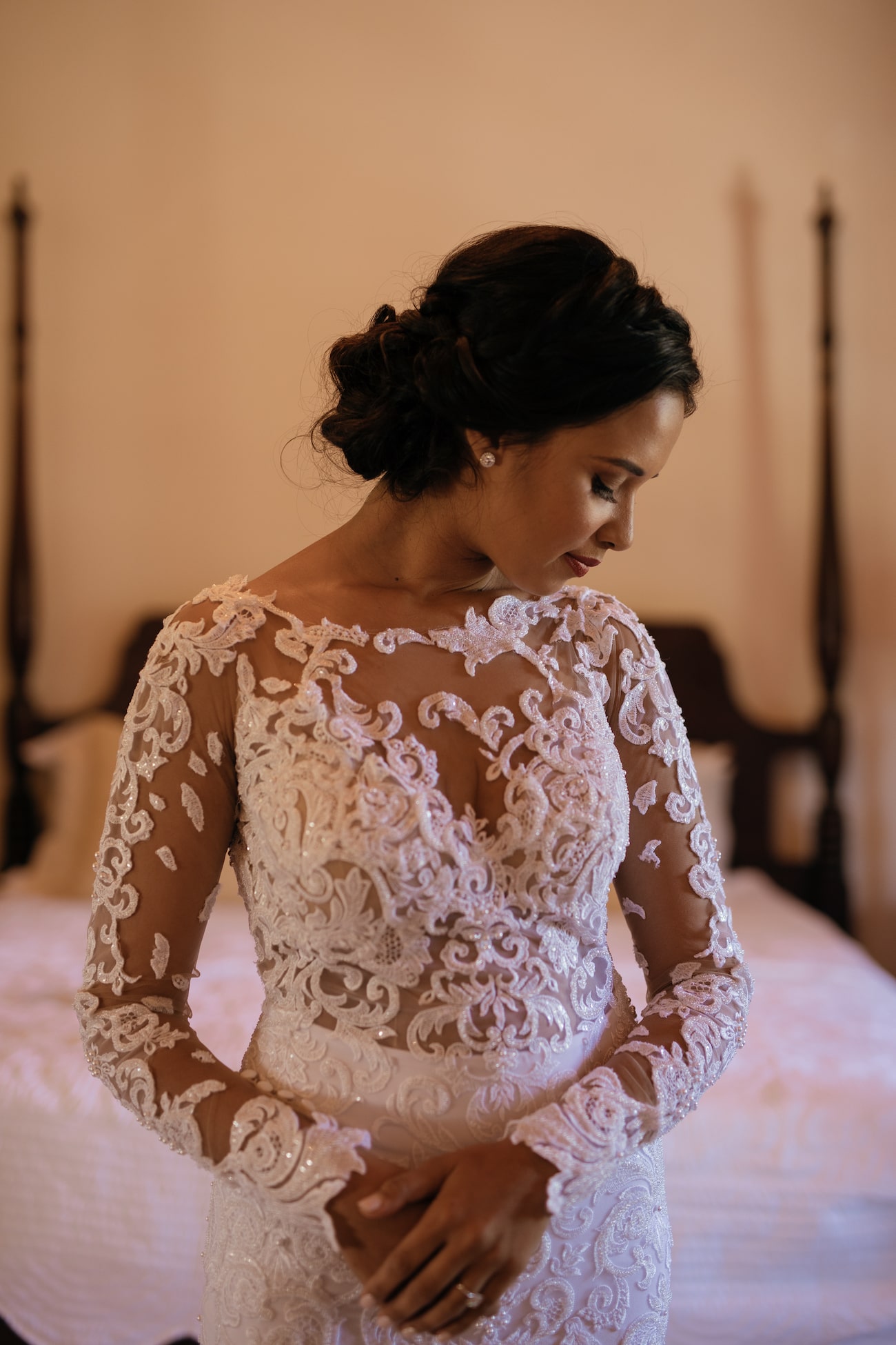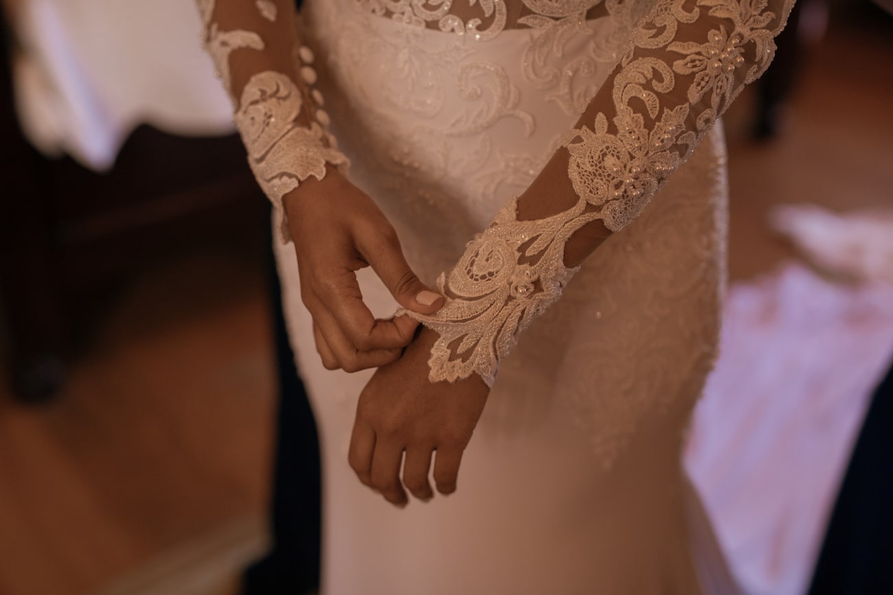I wanted a bit of both worlds, so I chose a fit and flare dress with long sleeves and low open back. However, I wanted to feel like a princess and that’s why I had a detachable tulle skirt with a long trail over my dress to exude elegance. The appliqué was done in a bold, imported beaded lace, covering the upper half of my dress. My dress was custom-made by the amazing bridal designer Robyn Roberts.