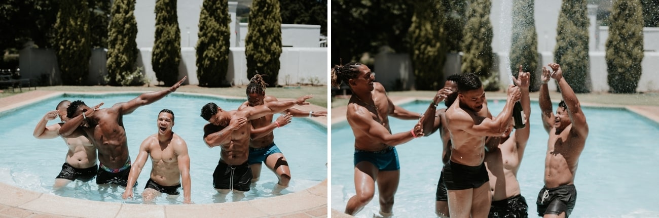 I don’t feature a lot of ‘celebrity’ weddings here on SBB – in general, I prefer to tell the stories of real people on the happiest day of their lives. But of course, celebrities are real people too, with their own real, beautiful love stories, and some of their weddings aren’t about the glitz and the glam and the feature on Top Billing, but rather the incredible joy of two people promising their lives to one another. So while you may recognise Cheslin Kolbe from his time at Western Province or as part of our Olympic medal-winning Sevens team, or most recently as a Springbok (yay!), you’ll really fall in love with his wedding to beautiful wife, Layla. I’ve been holding on to this wedding for a while to share with you this week, and I’m so excited to finally let it make its SBB debut! It’s classic, it’s elegant, and most of all it’s heartfelt. I defy anyone to watch the video and not get a little choked up when Cheslin does, as Layla walks down the aisle, or to grin along with them post ceremony – they both look happier than a man raising the William Webb Ellis. Also, I’m not gonna lie, there are some hot groom’s party images in here that you do not want to miss, since Cheslin was joined by (among others), our Springbok captain Siya Kolisi (along with his wife, Rachel, as a bridesmaid). What do you call a bunch of fit, shirtless rugby players in a swimming pool? A good day at work for Gaby, that’s what. Some of the other details we loved include Layla’s incredible Robyn Roberts gown, the timeless winelands setting, the fun cake topper, and of course, Layla and Cheslin’s sweet daughter as the most adorable flower girl ever! Huge congrats to the Kolbes, and to Lavender Creations for pulling off such a gorgeous event, perfectly captured by Duane Smith Photography.