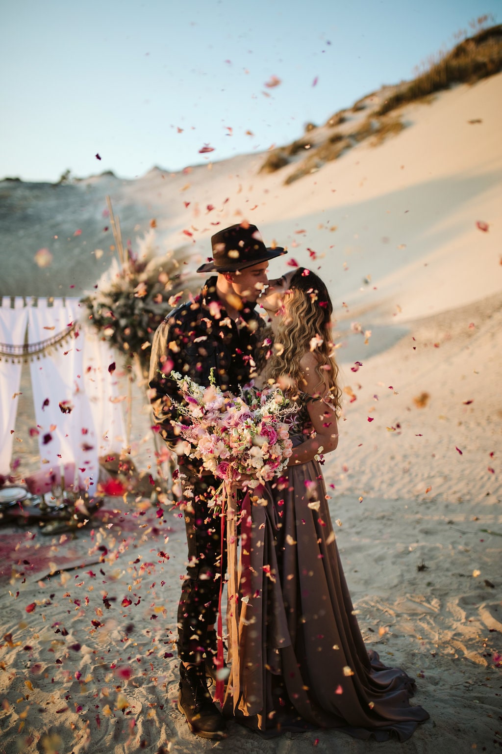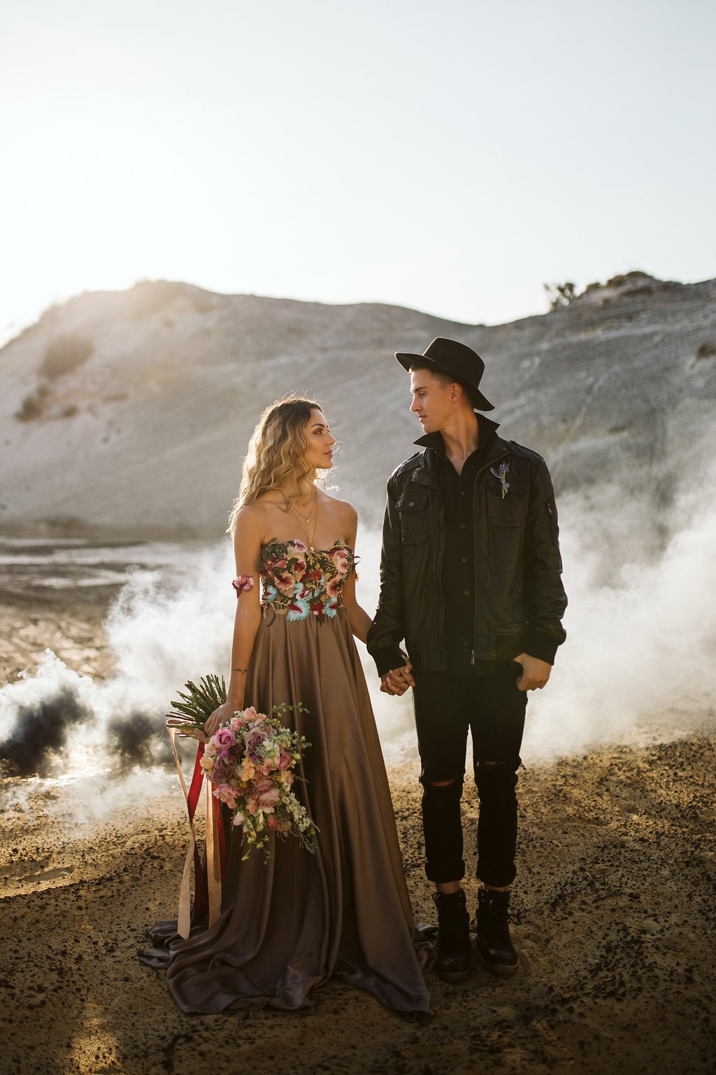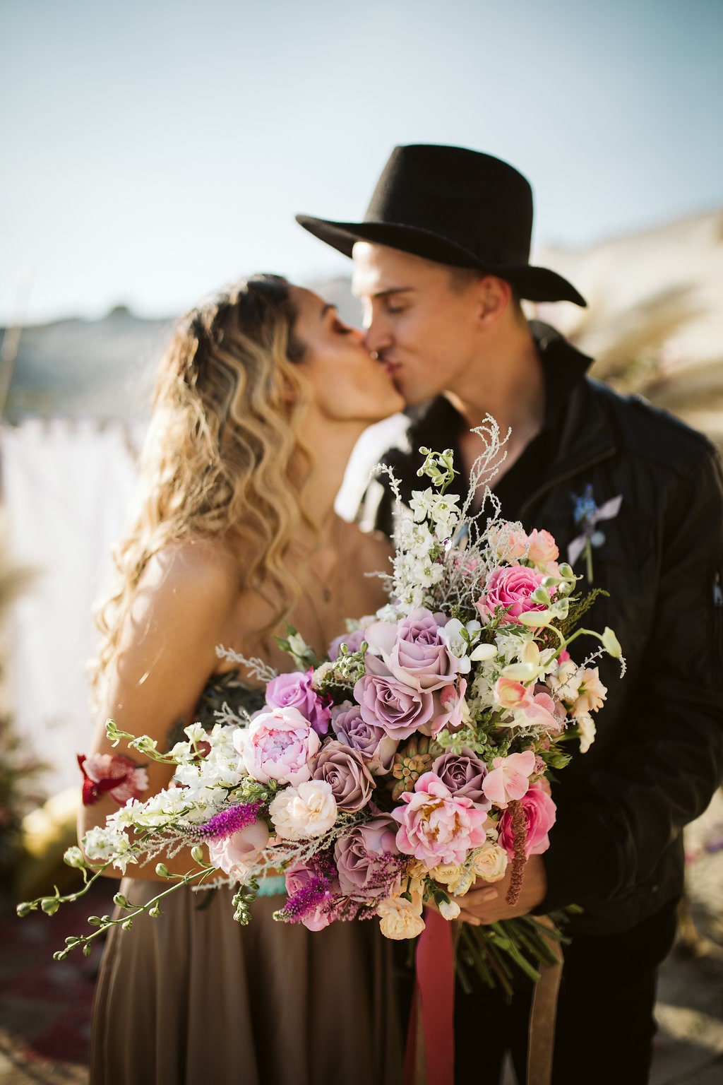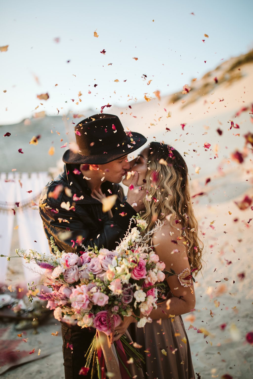 The flowers were done by floral genius, Fleurdita (Dale Sandberg). Her idea to create a hanging airplaint sculpture paired well with the tufts of pampas grass found naturally on site. The colours used in the arrangements complemented our decision to stay away from the much-used burgundy and gold combo – and make the move instead to include burnt oranges, dusty pinks, and honey colours. The couple, Bianca and Connor, have been together for six years and it’s only a matter of time until they do this for real! This type of elopement is perfectly suited to them, They have their own unique style (Bianca would rather wear a pair of Timberlands than wedding shoes), and we encouraged them to express themselves completely during the shoot – hence the sexy leather jacket and hat combo on Conner! The gorgeous boho-chic gown by Elli-Nicole encapsulates the day perfectly. Untraditional, free-flowing, organic, and earthy. The lace applique details pick up beautifully the flowers used in the shoot, and Bianca’s face when she saw the gown said it all!