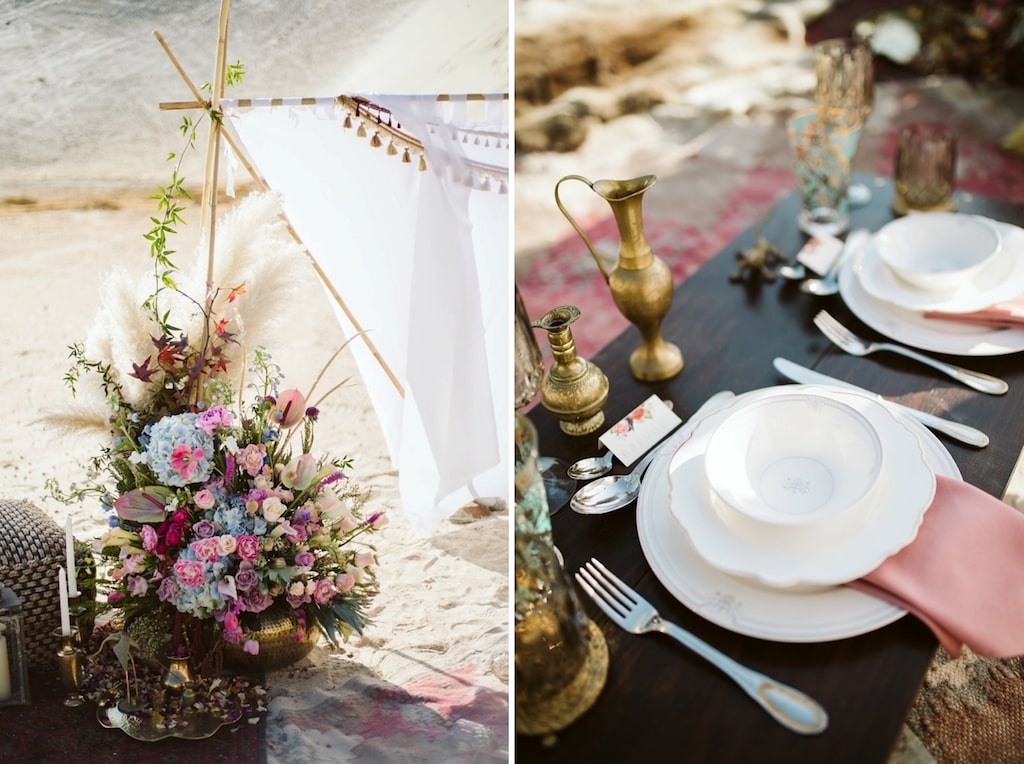 Not many South Africans explore the opportunity to set up camp in an open location to create the wedding of their dreams. We wanted to show how easy and attainable this actually is. Within two hours we had set up the perfect little elopement area with only four people working on it. It really is a great idea to find the perfect spot, and ask your vendors to come to you for your own custom setup! Since the sand dune at the location looks very desert-like, we decided to theme the shoot around the concept of the Nomad – ever-changing, ever-moving. A lot of young couples these days want something unique for their wedding. They want to create special photographs of their nuptials that no one else has. Overall, it was an incredible day with a lot of firsts (letting off those smoke grenades was terrifying for second shooter, Leigh Benson!), bumps on the head (second shooter Roxanne Roerink eventually had to stand holding the bamboo structure for over an hour in the hot sun, until the flowers were fully assembled, so that it didn’t blow over!). Not to mention, since it was a mine in Africa, we had CORTAC security as our own personal security detail – we felt like such VIPs!