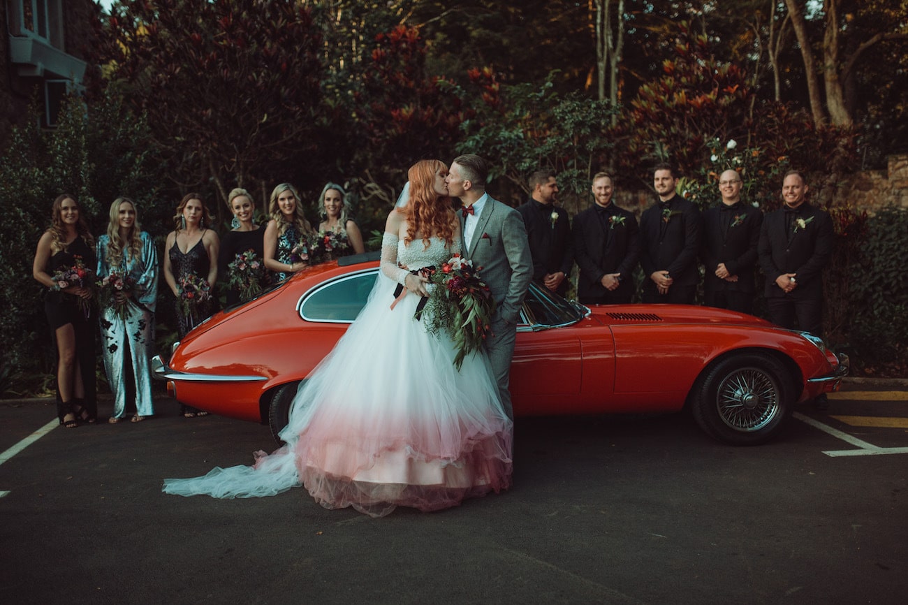 Giant balloons, confetti bombs, velvet table clothes and furniture… oh my! Today’s wedding sent to us by Lucinda of Luxe Events is very indie chic, full of fun details, happy smiles, and rich moody tones. The bride, Michelle, is a vision in her utterly unique, dip dye, pearl-beaded McCarthy Wolff gown, while her groom, James, is dapper in his slim tweed suit. Even the bridesmaids look seriously rad, in their black and silver mismatched gowns. There’s lush jewel coloured florals, there’s a gin bar, there’s a neon sign. Pretty much every cool detail you could want. But most of all, there’s James and Michelle in love, sharing their happy day (cocktail style!) with their nearest and dearest, which is of course the coolest part of all. Matt Kay Photography captured these images.