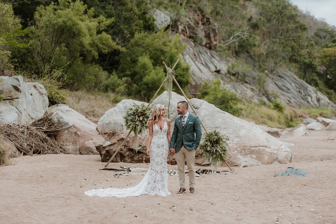 I’m pretty sure if I was planning my own wedding right now, I’d want it to be just like this one. An incredible location (I mean, a riverbed ceremony in the middle of the African bushveld and a reception under the stars? Dying), a handful of my favourite humans, a breathtaking lace gown, boho wedding details, a protea bouquet, and of course my sweetheart by my side. This is what Adam and Natasha chose for their nuptials, and you guys, it is stunning. From their ceremony beneath a floral tipi to their beautiful, radiant couple shoot images, it’s all just so picture perfect – thanks also to the gorgeous images by Derryn Schmidt of course! I have no doubt you bushveld loving brides will be totally inspired for your own big day, out under our endless South African skies.
