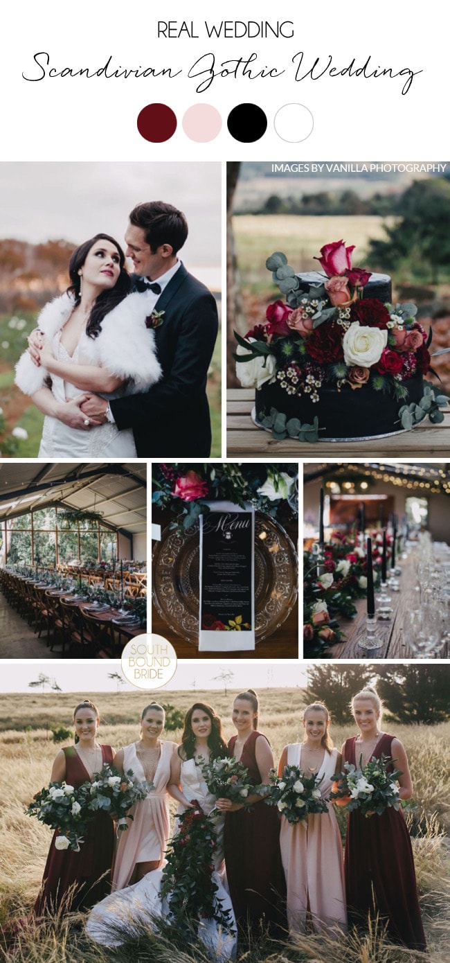 Where do I even start with this wedding, you guys? Maybe the concept, kind of a Gothic romance meets Viking feast meets meets Hollywood glamour (especially thanks to the bride and groom, Jessica and Renier, looking like a pair of Tinseltown starlets!). Or maybe the bridesmaids’ dresses, which would have to make my list of top ten faves of all time. Or the flowers (oh my WORD the flowers), dripping from top to bottom of the beautiful Midlands reception space and bringing to life the palette of black (LOVE the way it’s used here), blush and burgundy. Or maybe I should just start with the suppliers, because really, the credits read like a who’s who of my fave Natalians – Michigan Behn for Vanilla Photography, Joe from Oh Happy Day (love how every single OHD wedding is so different!), the supremely talented Carolyn from Adore Weddings, and more. It’s the kind of wedding that makes my heart glow, and not just because of the cozy wintery vibe! So let’s dive in, shall we?