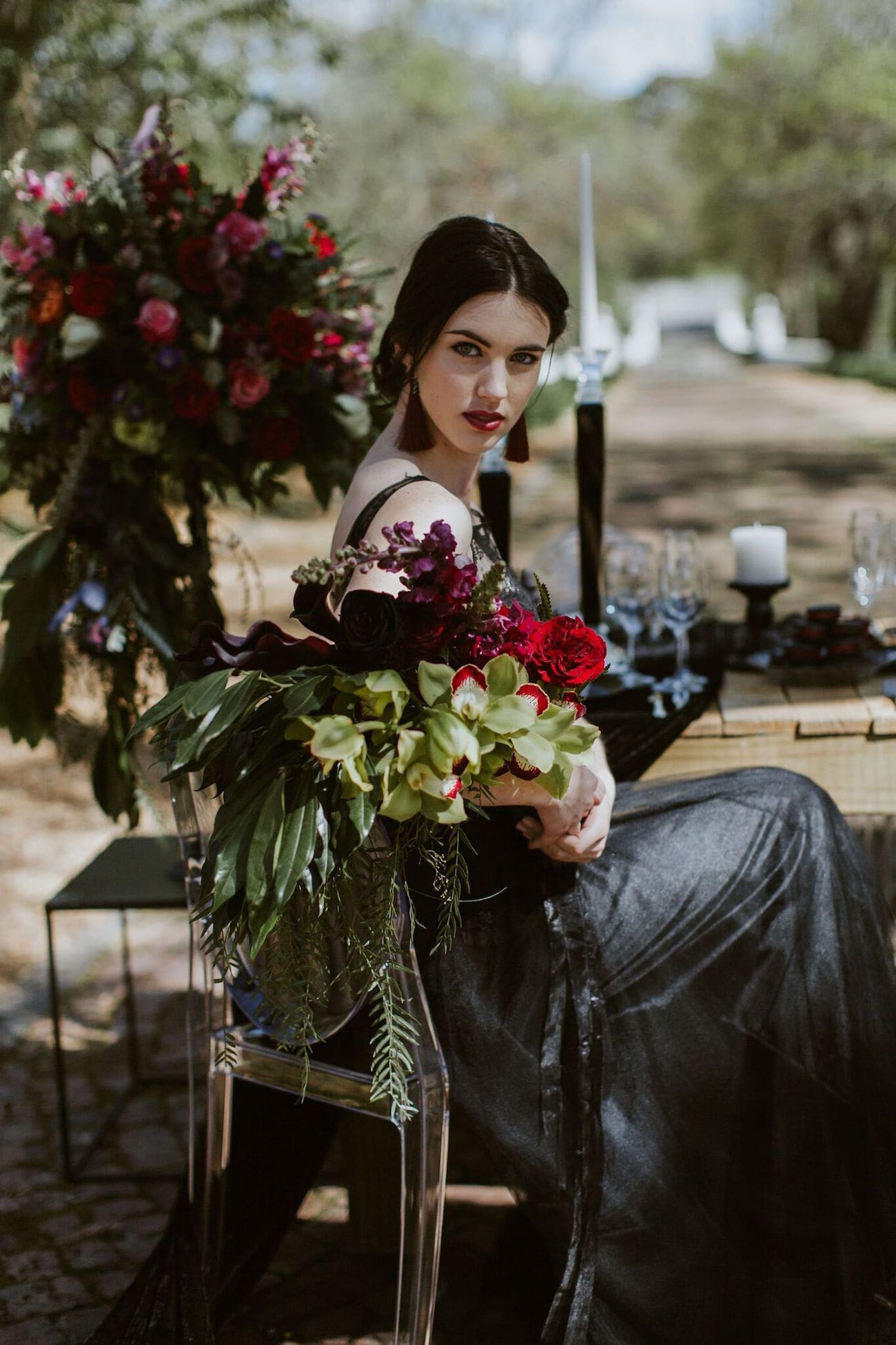 Happy Halloween! You know, every year at this time, I choose to feature at least one shoot that’s darker than my usual fare – a little bit kookier and spookier, although most haven’t actually been Halloween themed as such. But I don’t think there’s ever been a time where this kind of dark and moody inspiration is also super on-trend. Bold florals popping against black backgrounds and rich jewel toned palettes are definitely the look du jour as we head into the new season, and while this bold, glamorous look isn’t every bride’s cup of tea, it really makes for a stylish and refreshing visual change that is sure to get your guests talking! So while this might be the feast of All Hallows Eve, I think this gorgeous black wedding inspiration from a local team including A Dream Come True Events, Blue Olive Events, and Anna Pepper Photography will be inspiring you SouthBound brides long past the holiday. Let’s get moody!