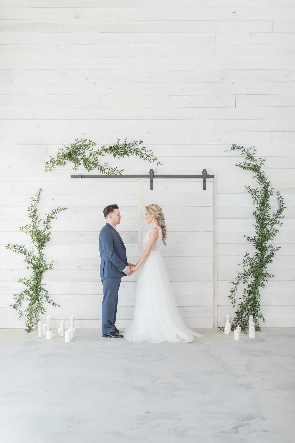 We’re starting our week off BEAUTIFUL with today’s styled shoot, an elegant fusion of minimalist and organic style that I am absolutely in love with! It comes courtesy of Carolina Goodwin Photography and her talented team, and features an understated greenery arch, stylish florals, a gorgeously classic cake, and the most amazing stationery! For the tables, a soft white silk linen runner laid with simple greenery interspersed with votives, a napkin tied with more greenery, and a copper calligraphy scroll placecard. Perfection! That’s the thing about this kind of luxe minimalism – the details aren’t many, but every single one of them is carefully chosen and placed and the end result is harmonious and delightful to the eye! Super inspiring. To create it, Carolina says, she “wanted to evoke the spirit of the outdoors by using loose, natural floral arrangements. The movement conveys a sense that they are growing! The use of white negative space highlighted with just simple greenery gives a very earthy and organic feeling that brings elegance with minimal adornment.” Let’s dive in, shall we?